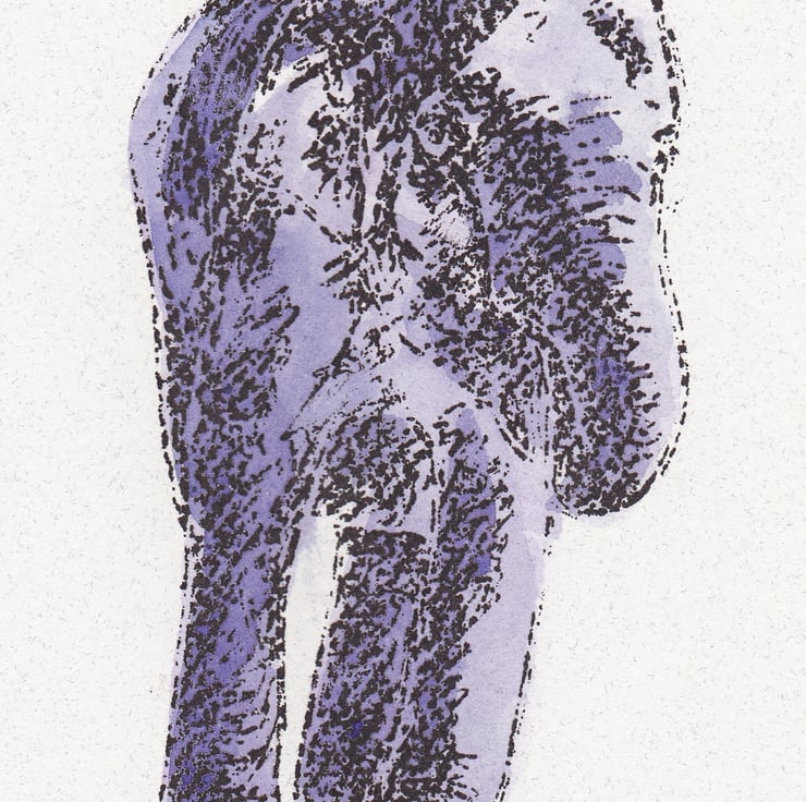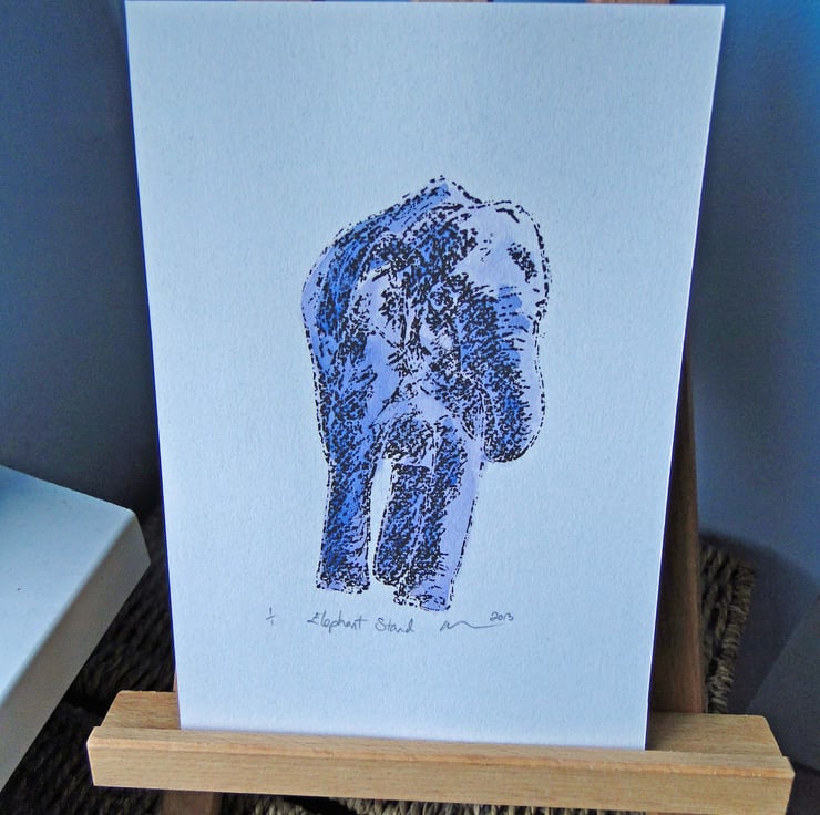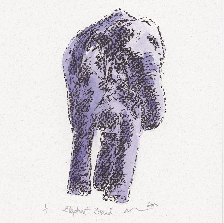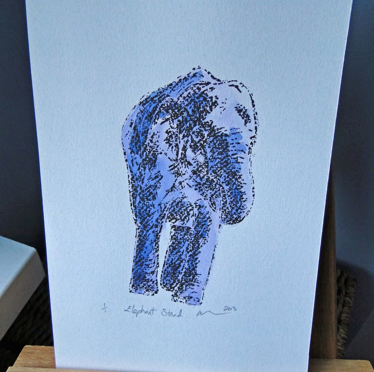 Gocco print of an elephant printed in black ink onto white/cream card. A purpley watercolour wash is then applied over the elephant so each one is slightly different.