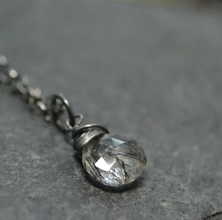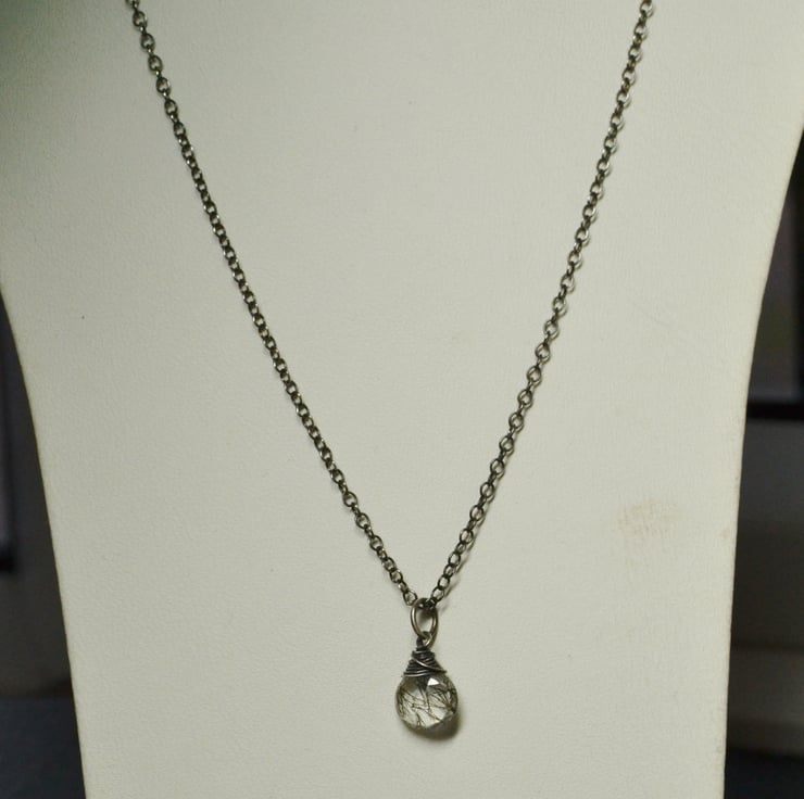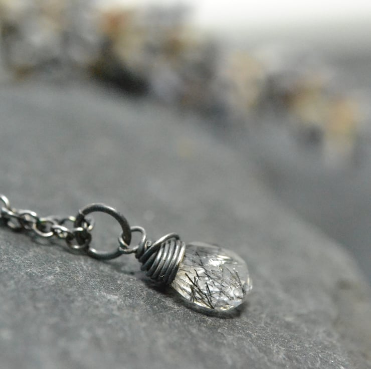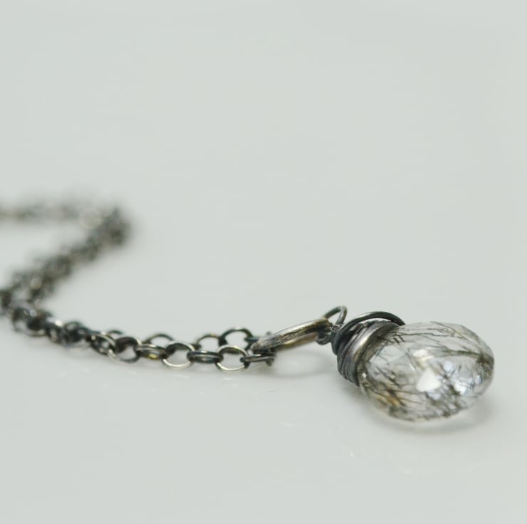 An oxidised sterling silver trace chain, hand polished to a gorgeous shine, holds a sterling silver wrapped AA quality tourmalinated quartz briolette. Tourmalinated quartz is a clear gemstone which holds random black shards. Such a gorgeous stone.