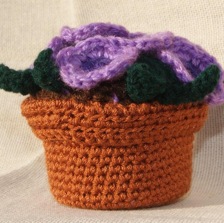 A posy of pretty mauve flowers Ideal for Mother's Day, Valentines day or to brighten a desk. About 8cm tall. Both the flowers, foliage and pot are crocheted.