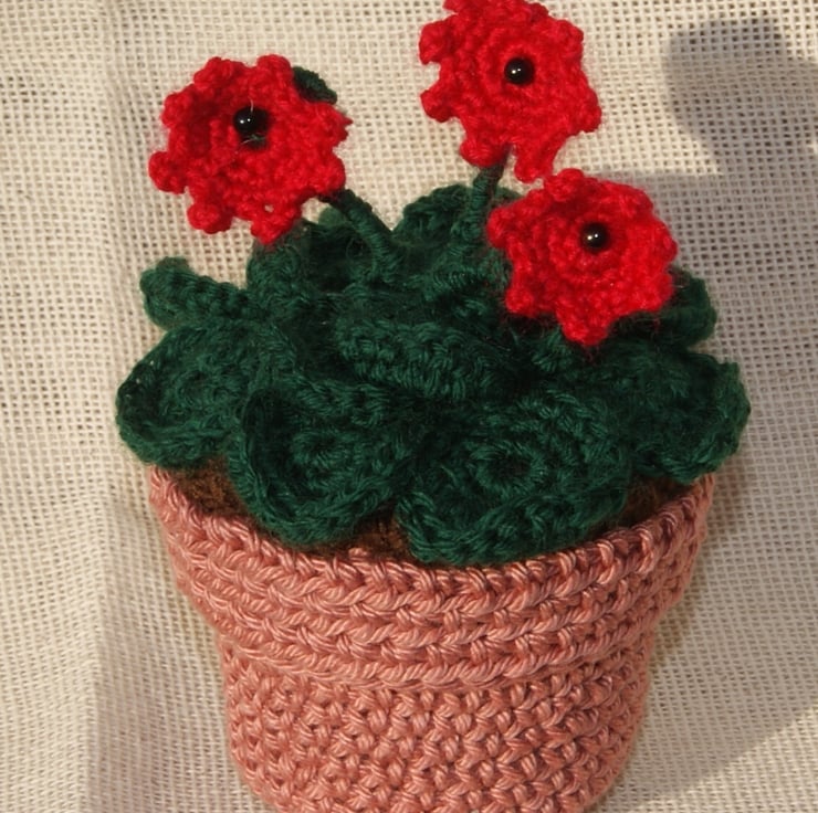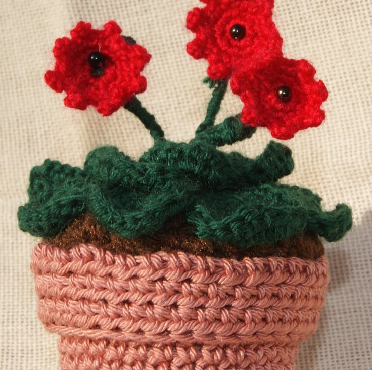 A posy of pretty red flowers Ideal for Mother's Day, Valentines day or to brighten a desk. About 12cm tall. The flowers, foliage and pot are all crocheted.
