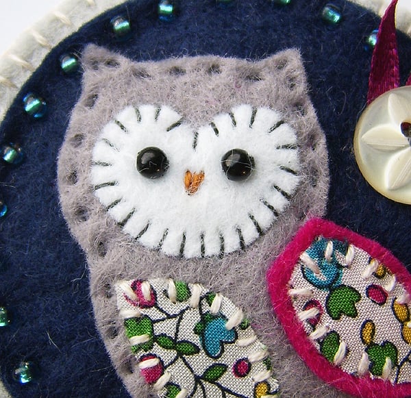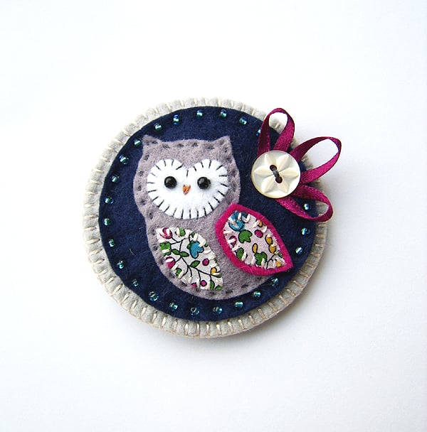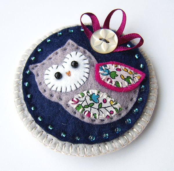 It features a little felt owl with appliqued wing and belly in pretty Liberty print fabric. It is mounted onto a dark blue felt base which is edged with turquoise seed beads. It is further mounted onto a light grey felt backing and is finished with a little button and ribbon detail. It has a metal brooch pin on the reverse side for easy attachment.