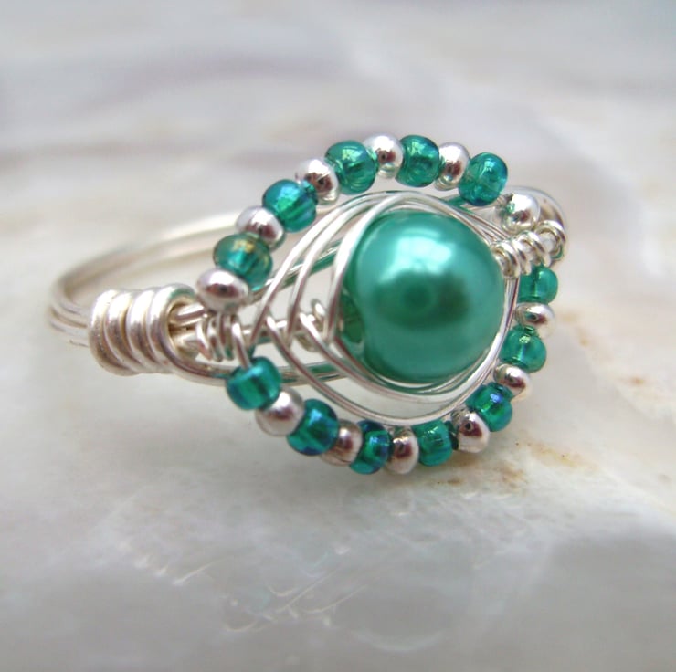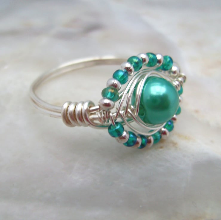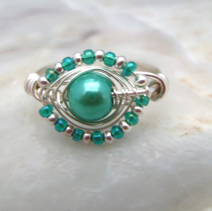 This ring has been handcrafted using silver plated wire & a focal glass pearl effect bead & smaller seed beads & silver plated spacer beads.
