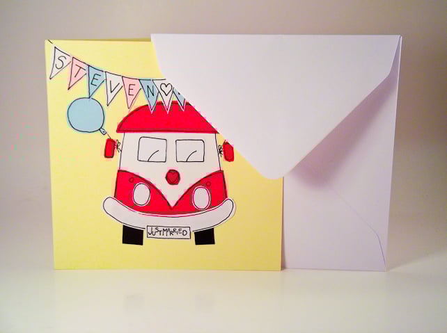 Each image is created individually by cutting out each section of the picture in coloured paper from my originally designed template. The sections are then layered to create the final piece. I then hand draw around the outline to enhance the look of the finished art work, adding the personal touch by hand writing the greeting onto the Bunting and licence plate.