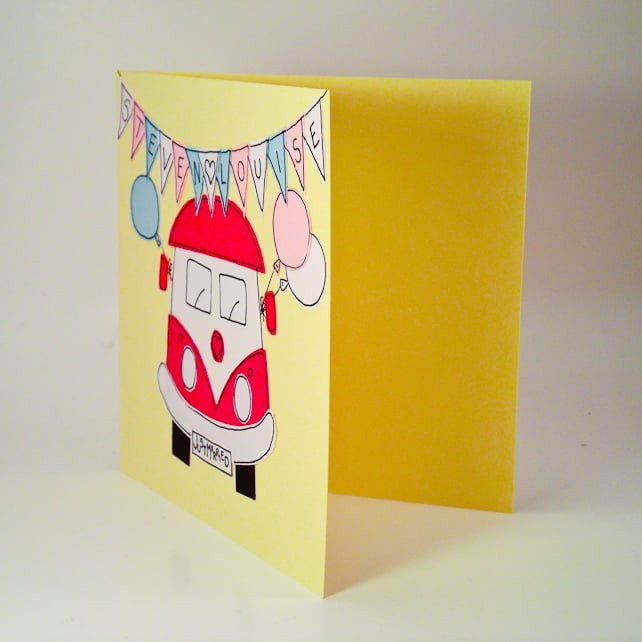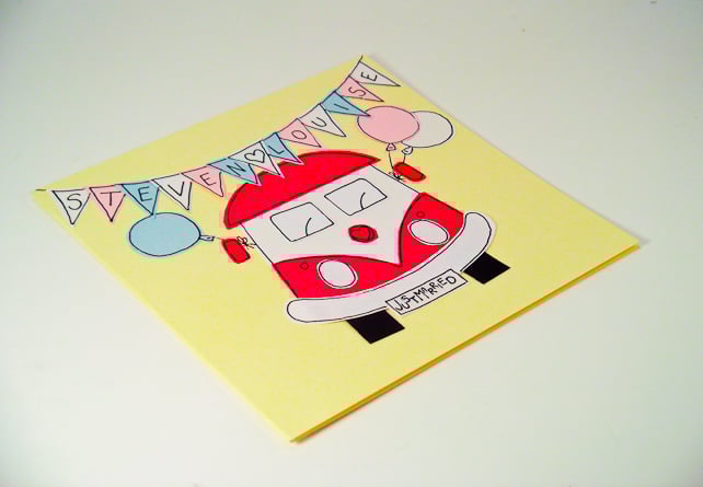 This card can be personalised with your Loved ones name hand written on to the bunting as shown in the photographs and a message put on the license plate.