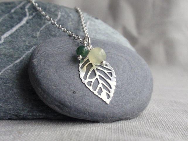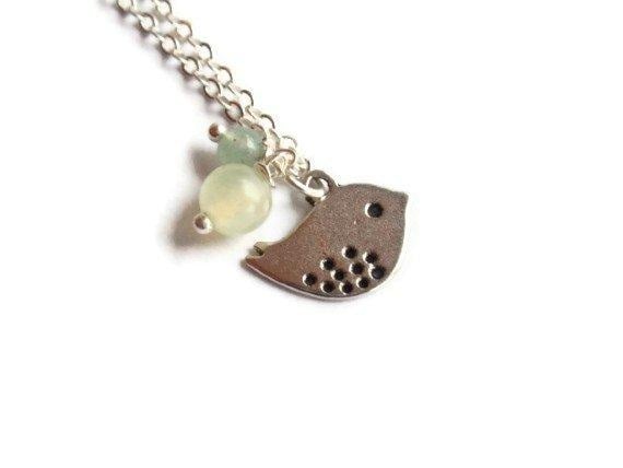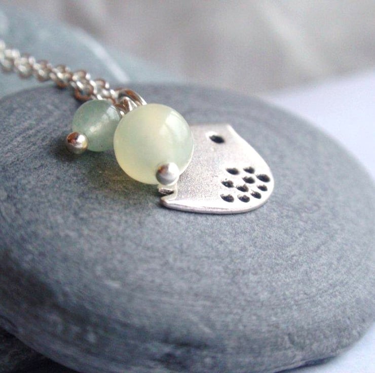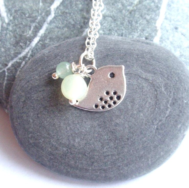 Silver plated bird necklace with pale green jade and aventurine beads. Comes on a silver plated 18 inch chain (please state if you prefer 16 inches or a different length).