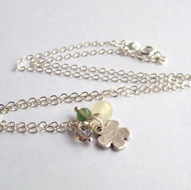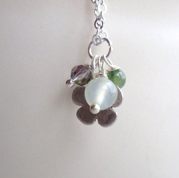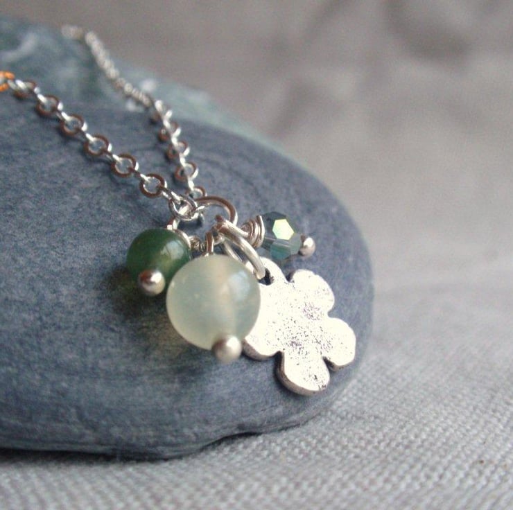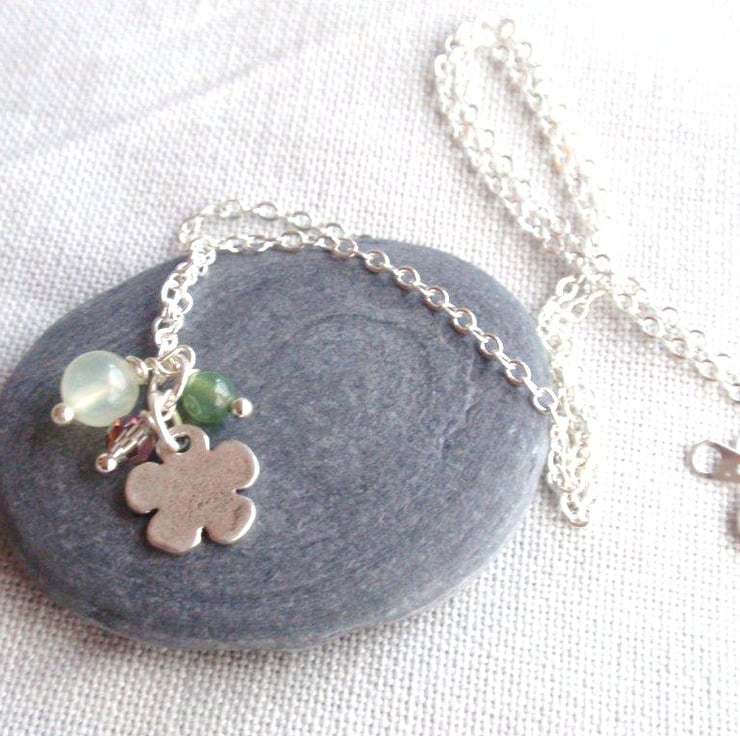 Metal silver flower necklace with gemstone beads, pale green jade and green moss agate with a little faceted crystal.