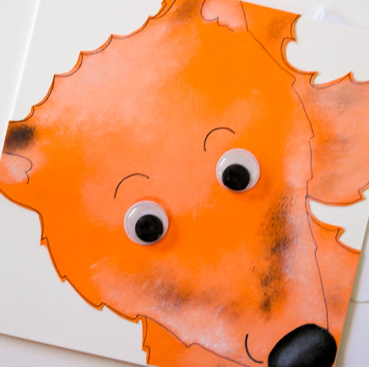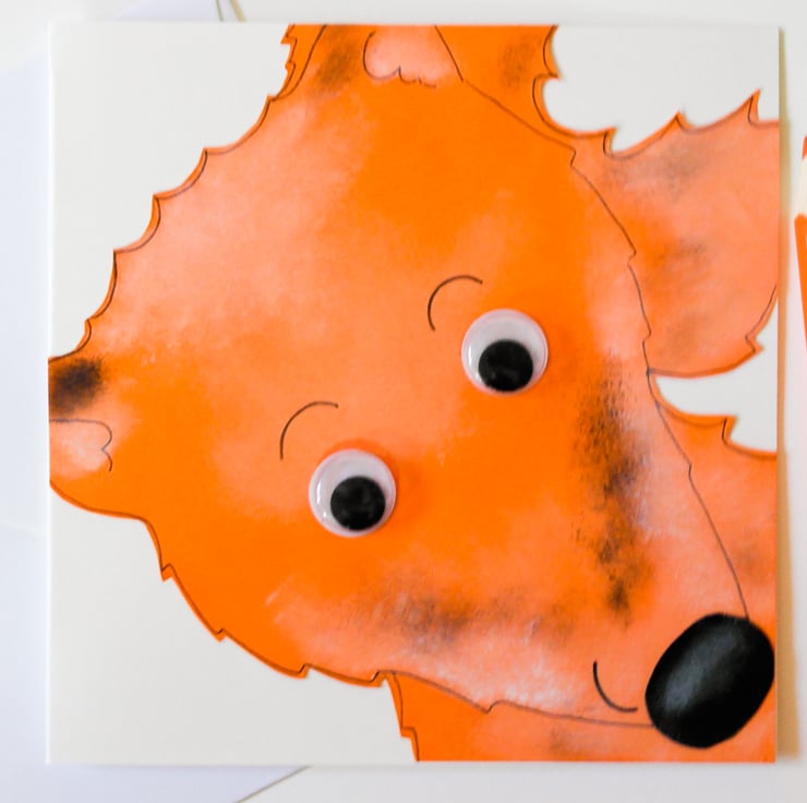 Each image is created individually by cutting out each section of the Fox in coloured paper from my originally designed template. The coloured sections are then layered and glued to create the final piece. I apply black and white ink to add the colour to the fur. I then hand draw around the outline features to enhance the look of the animal, I add the googly eyes to bring them to life giving them their own individual character.