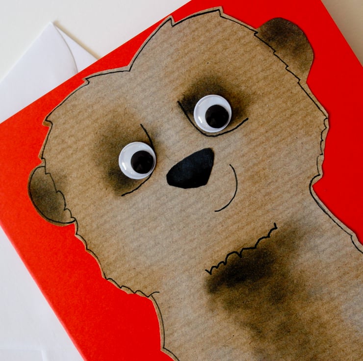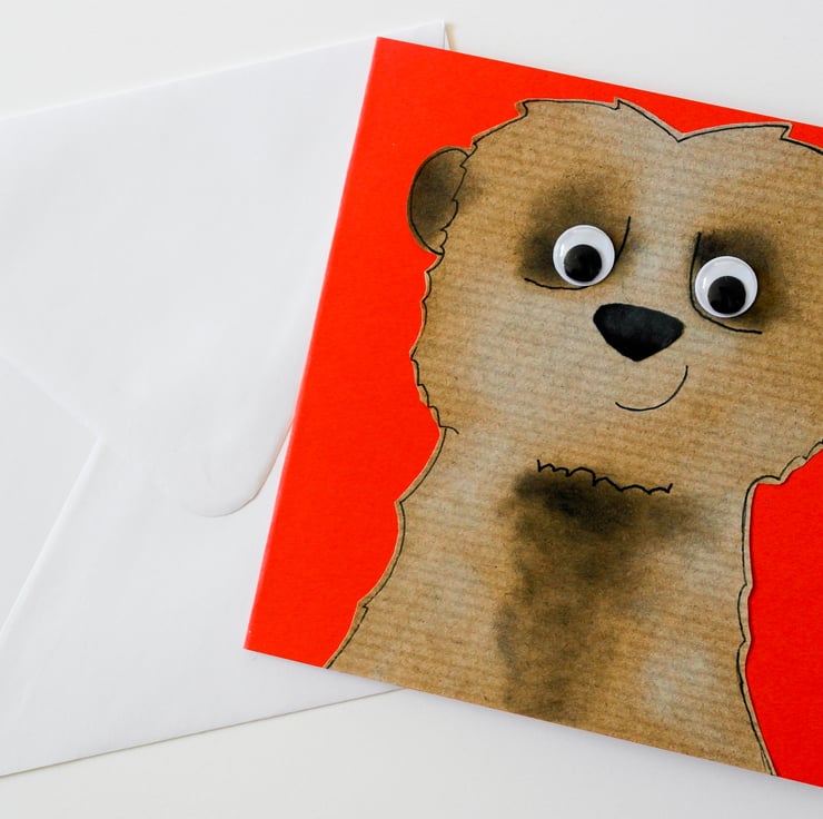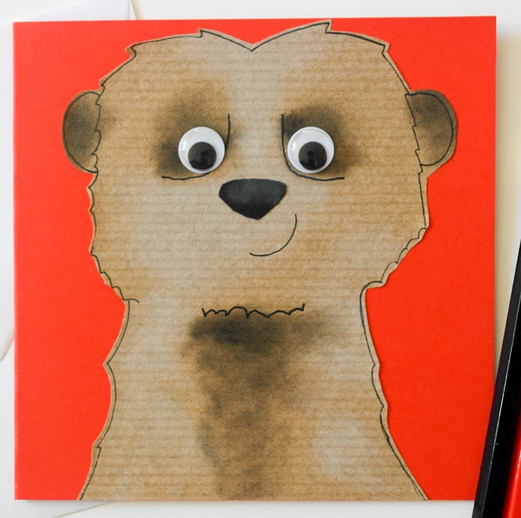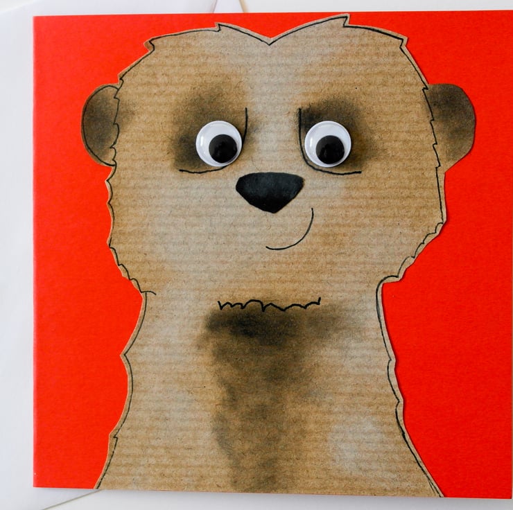 Each image is created individually by cutting out each section of the animal from my originally designed template in colored papers. The sections are then layered and glued.I then use black and white inks on the surface of the meerkat to create the colours on the final piece. Finally I hand draw around the outline features to enhance the look of the animal, I add the googly eyes to bring them to life giving them their own individual character.