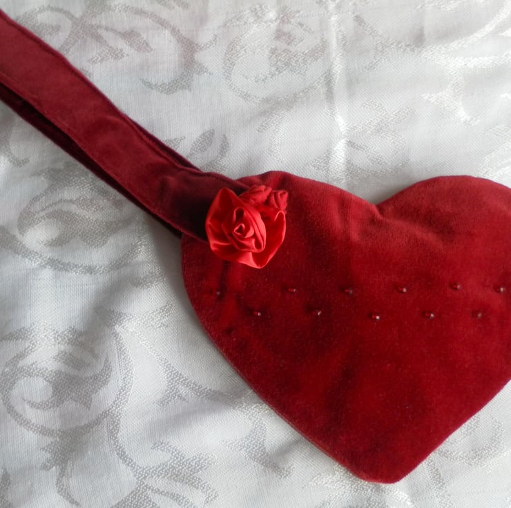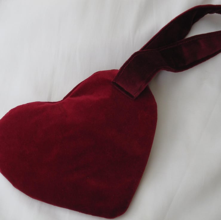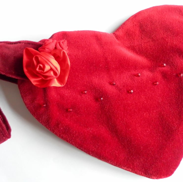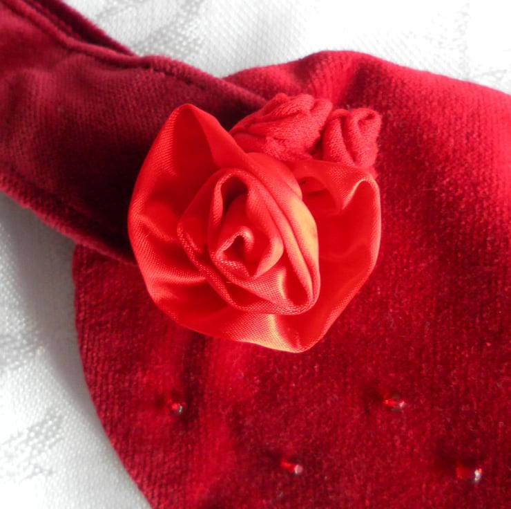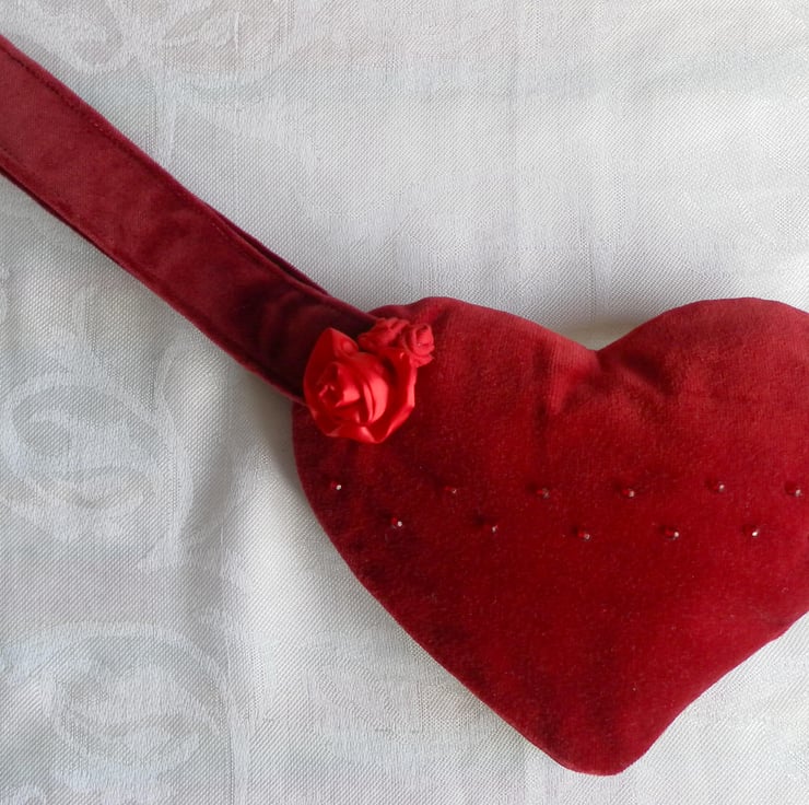 This beautiful red velvet, heart shaped bag is decorated with three handmade, fabric roses and 12 red glass beads. It has a side zip and is lined with dark, dusty pink cotton. The bag is 21cm x 17cm and the handle is 40cm x 4cm. It is interfaced for structure and strength.
