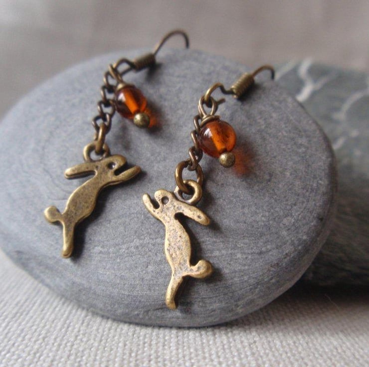 Bronze leaping hares with a little amber bead.