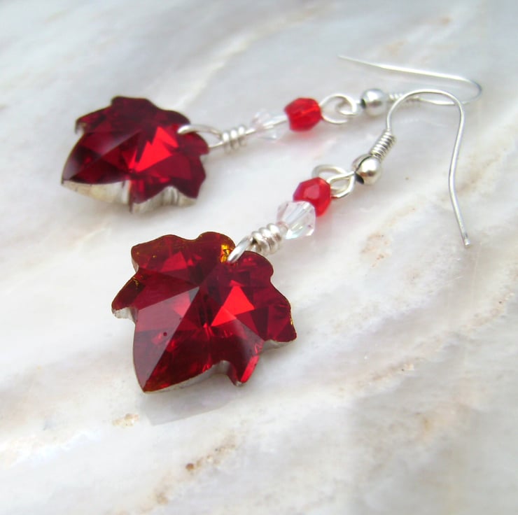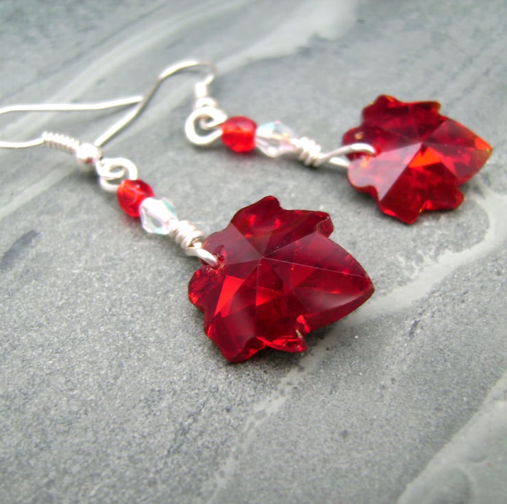 This pair of lovely christmas red earrings have been created using beau verre red crystal leaves with glass crystal 4mm beads & silver plated wire, hung on silver plated ear hooks. They will be sent in a gift bag. An ideal gift for your loved one.
