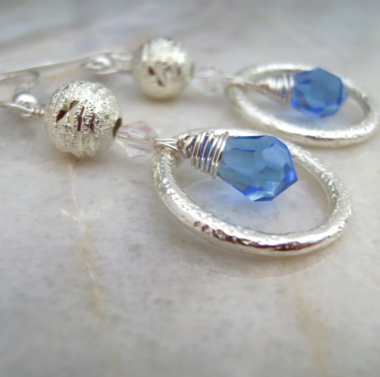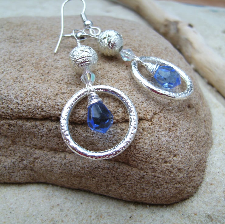 This lovely pair of earrings has been created using 2cm silver plated hoops & faceted glass crystal drops in sapphire blue colour. They have been connected with silver plated wire , 4mm clear crystal beads & silver plated beads. They are hung on silver plated ear hooks & measure approximately 5cm from the top of the ear hook to the base of the hoop.