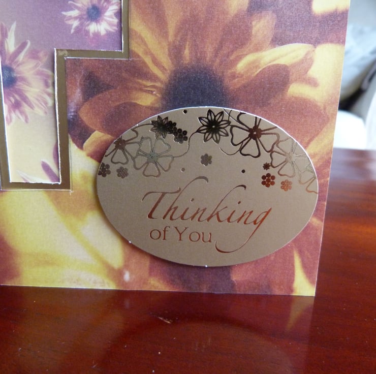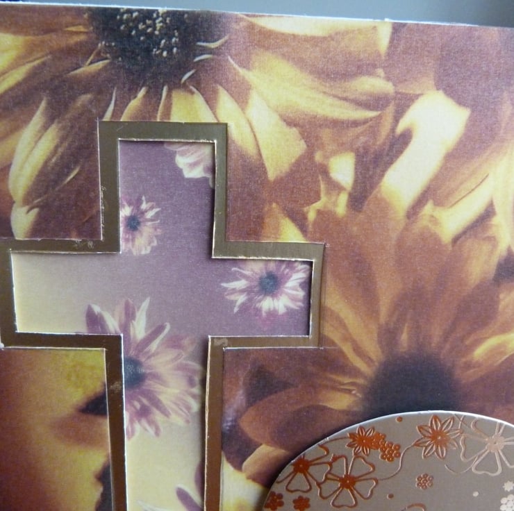 A card made from quality textured card. A pretty daisy patterned vellum which has had a cross shaped aperture handcut out. The cross has been edged with gold card and backed with a smaller gold daisy vellum. A thinking of you topper made from gold card.