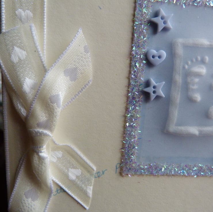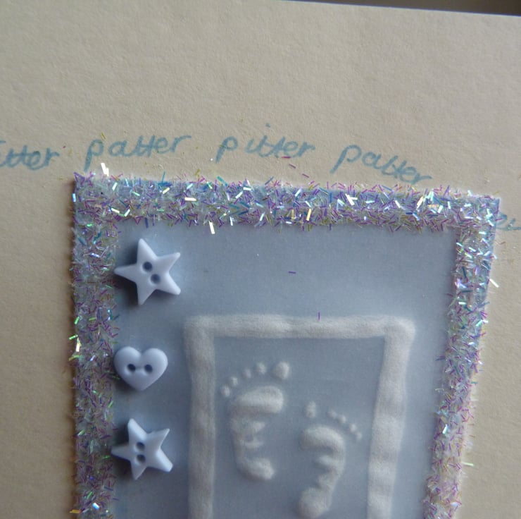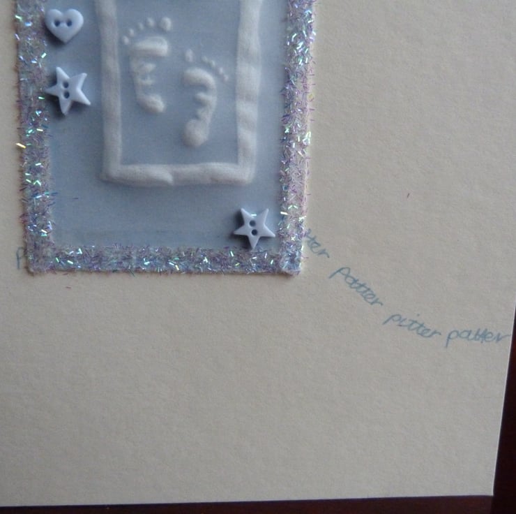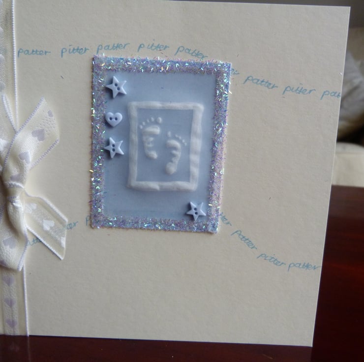 A quality textured white card which has the words pitter patter hand written in swirls across the card. Two tiny baby feel have been embossed onto parchment and mounted onto the card. The parchment has been edged with tiny fairy glitter and embellished with tiny baby blue star and heart shaped buttons. The edge of the card has been finished off with heart ivory ribbon and bow.