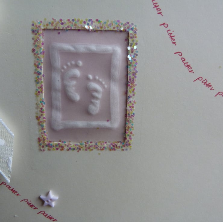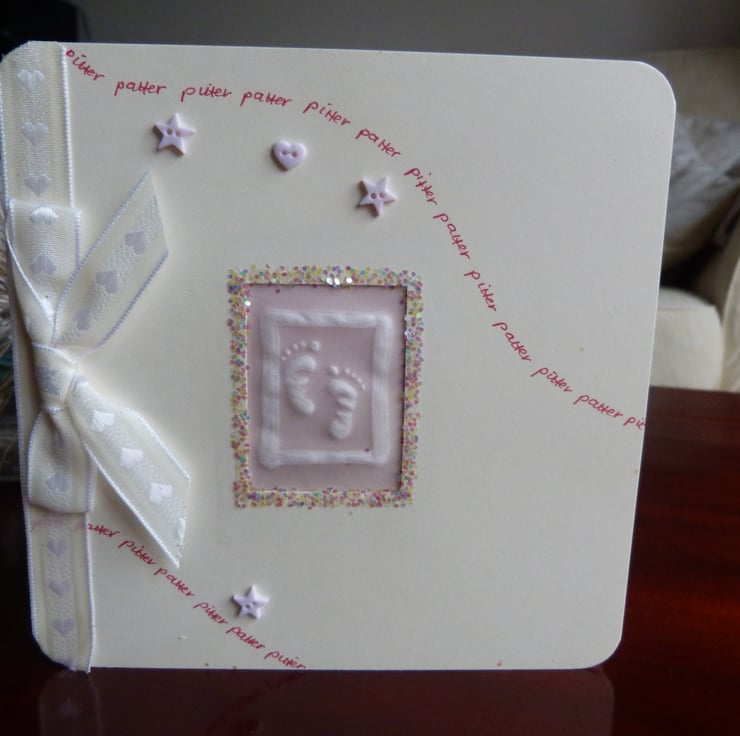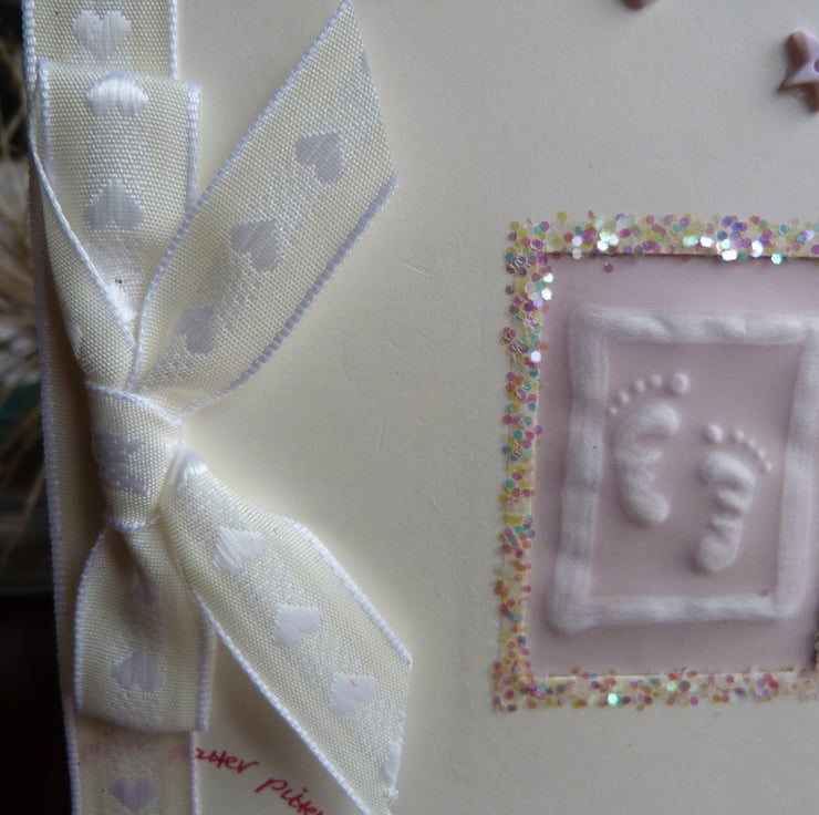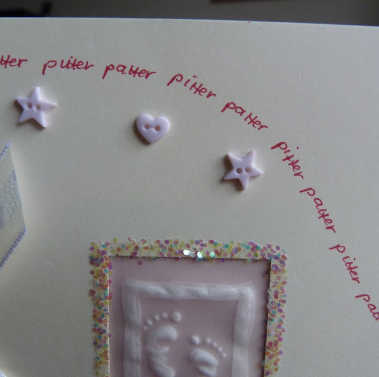 Quality cream card which has had aperture handcut which has been filled with a piece of parchment which has had the cutest pair of tiny baby feel embossed. Surrounded with holographic fairy glitter. Pitter patter handwritten in pink in swirls across the card which has also been embellished with tiny baby pink star and heart shaped buttons. Finished off with ivory ribbon and bow.