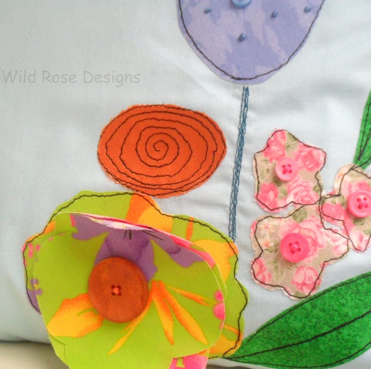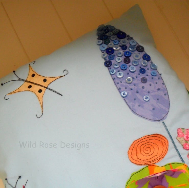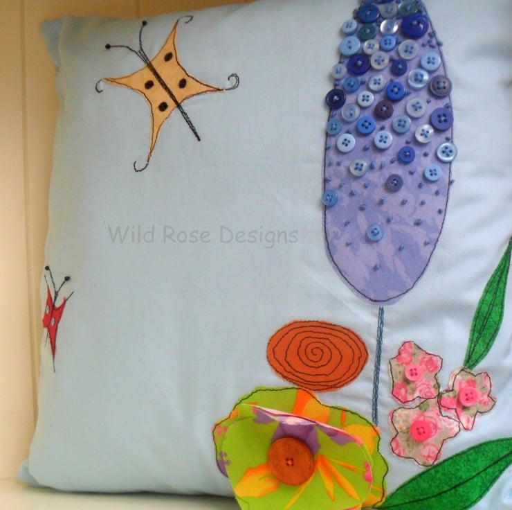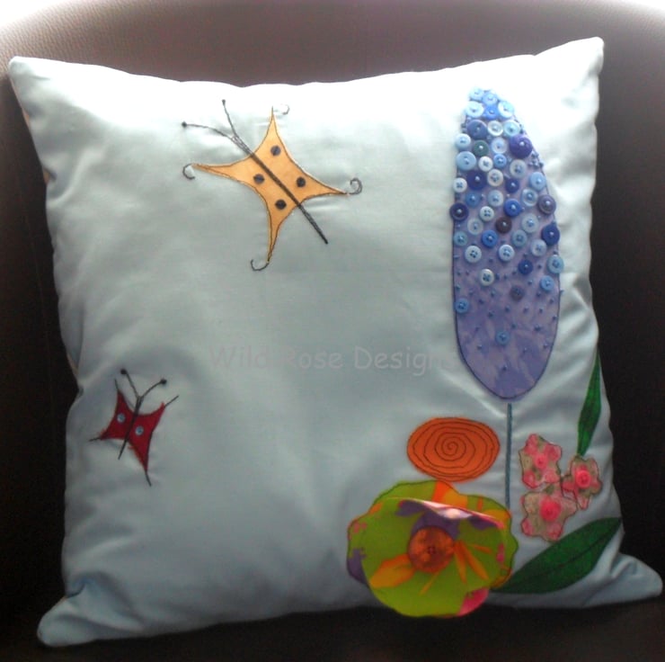 A beautiful handmade cushion with a 'Flowers and Butterflies' design. The design which is on a blue cotton background is made using applique, beads, sequins, embroidery; both machine and hand and buttons - lots of them! The cushion back is a cream textured cotton and it has a concealed zip. A 16" polyester cushion pad is included. The front of the cushion is backed with a cream lining and all seams are overlocked.