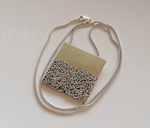 This modern and unique pendant is completely handmade in sterling silver 925 and 99.9 fine silver wire. It has been textured, partially oxidized and polished to a bright and shiny finish .