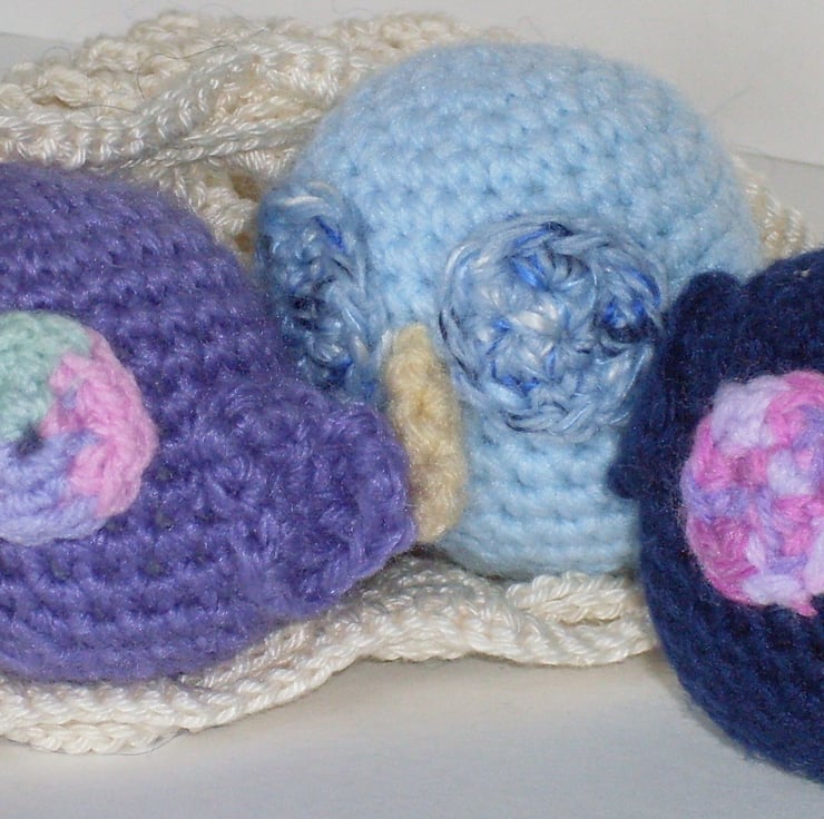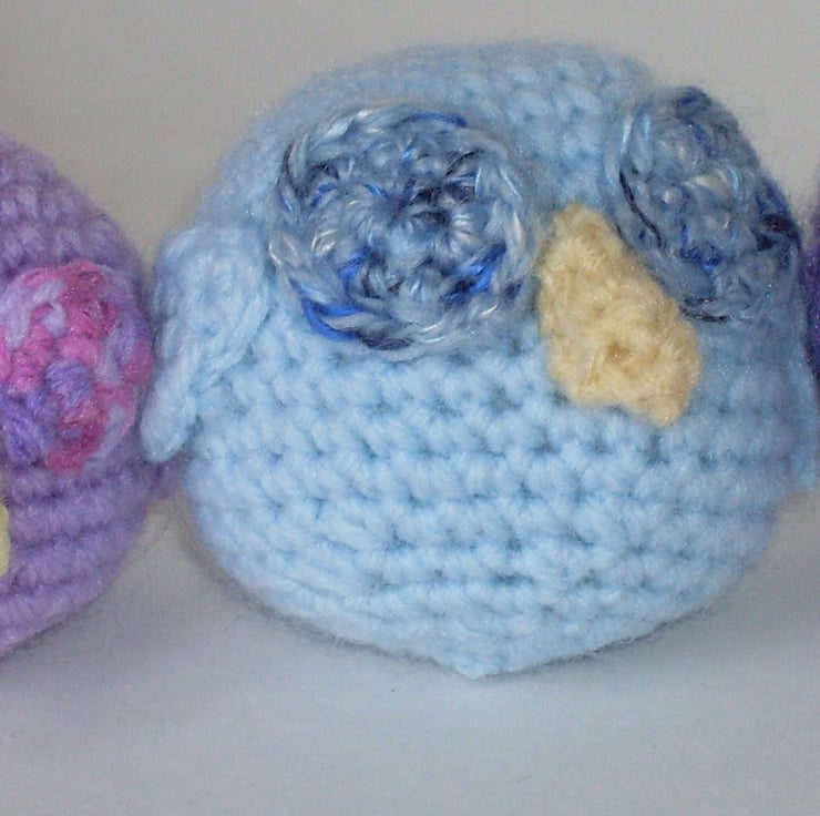 -These cute owlets are crocheted in a range of toning shades of blue.in sets of three.