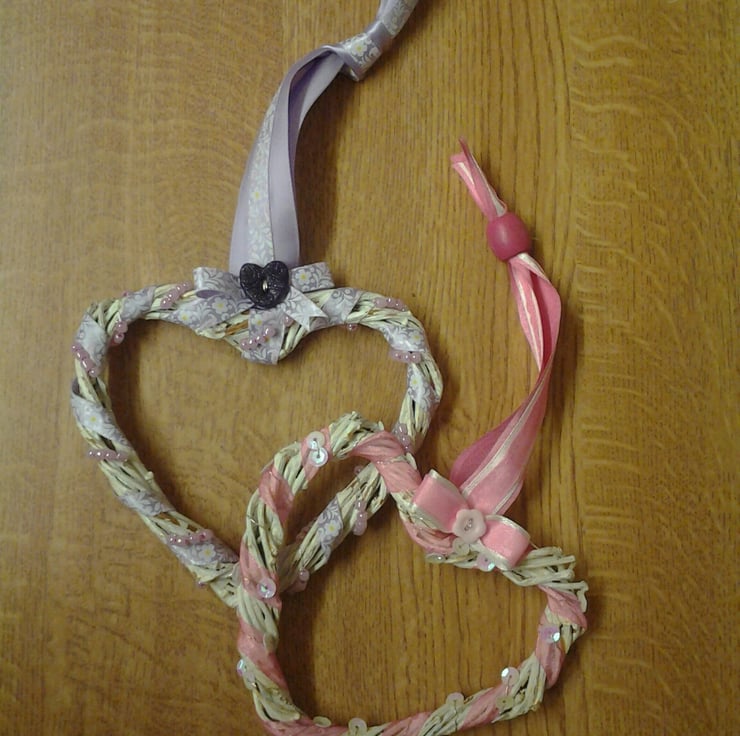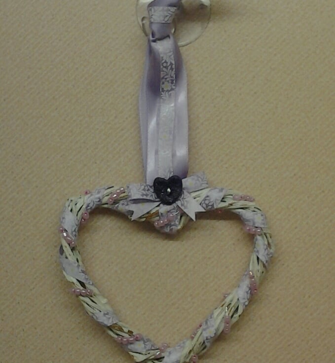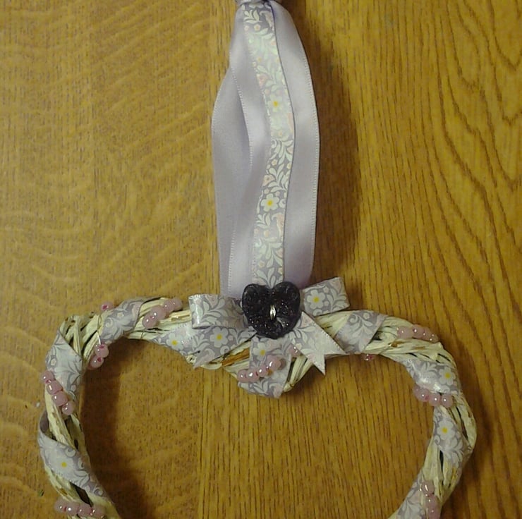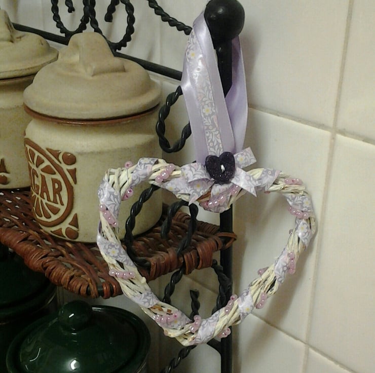 This lovely heart decoration has been made using willow, then painted white and decorated with pretty lilac ribbon and wired glass beads giving it a beautiful shabby chic look. Its length hangs approximately 21cm with another 6cm of ribbon above the knot and the heart itself measures 13cm x 12cm.