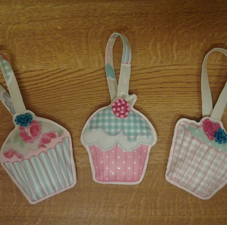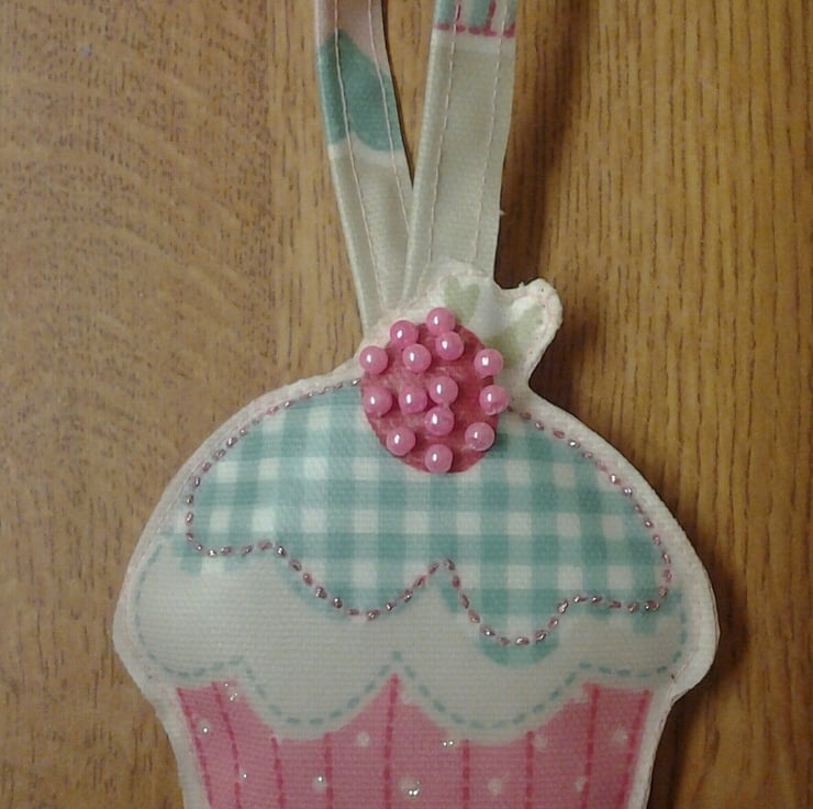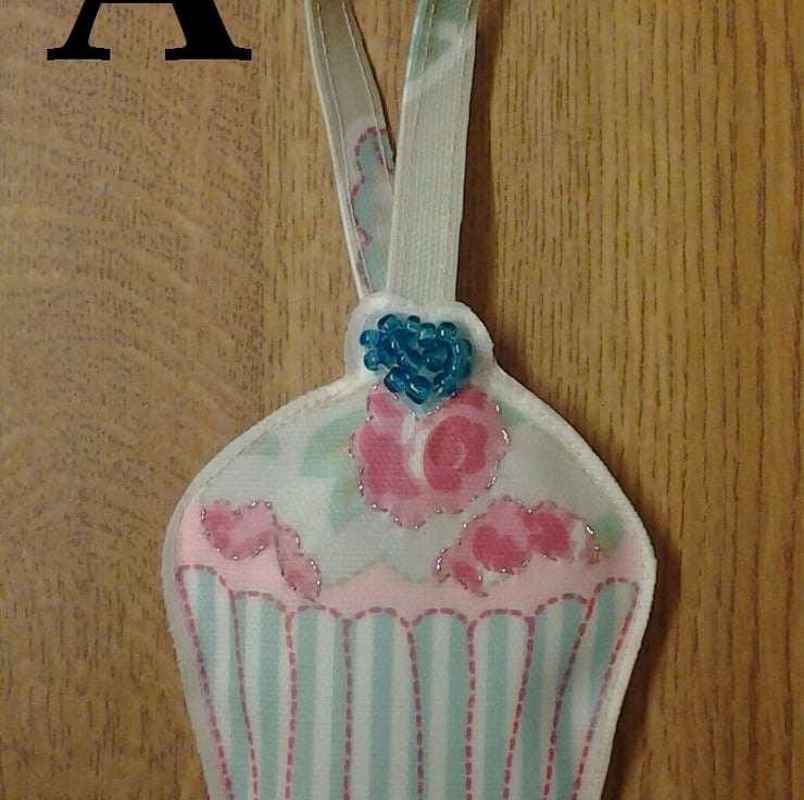 These delightful cupcake bag charms have been made using plastic coated cupcake print fabric. The cupcake have been stitched with sparkly cotton and embellished with beads to make them more decorative.