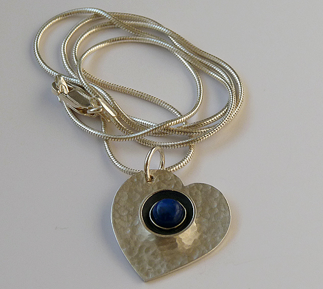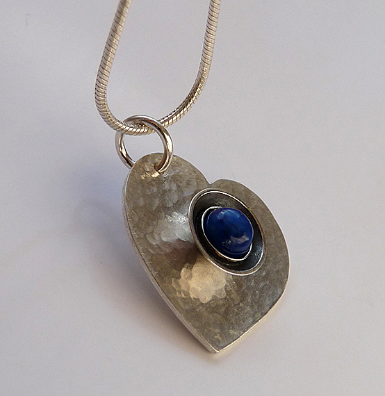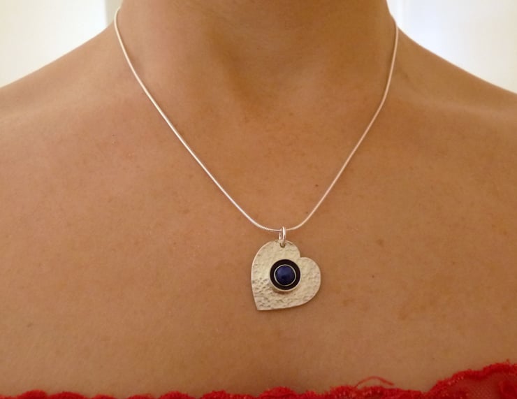 This lovely heart pendant with Lapis Lazuli is entirely handmade in sterling silver. It has been formed, textured, soldered and polished to a bright and shiny finish. It hangs on a sterling silver chain 45 cm (18" ) which can be easily taken off . If you prefer shorter chain 40 cm (16 ") or longer 50 cm (20") please let me know in the Note to Seller at checkout.