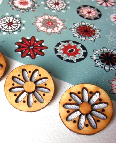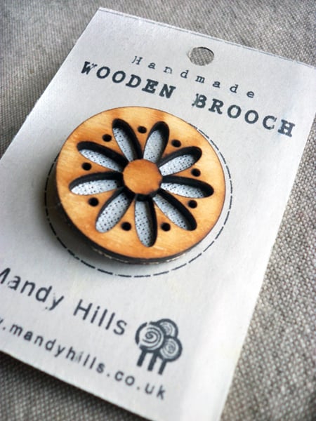 My newly made wooden flower brooch has white cotton for the petals and brown felt for the backing which has a brooch pin sewn into the felt too. Inspired by geometric Spirograph shapes and a screen print I made last year which can be seen in the photos.