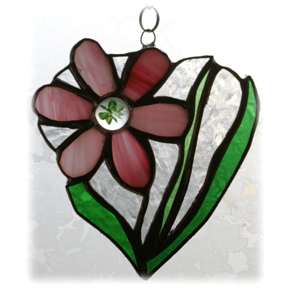 The flower is enclosed in a heart shape with the surrounding glass in clear but very prettily textured glass.