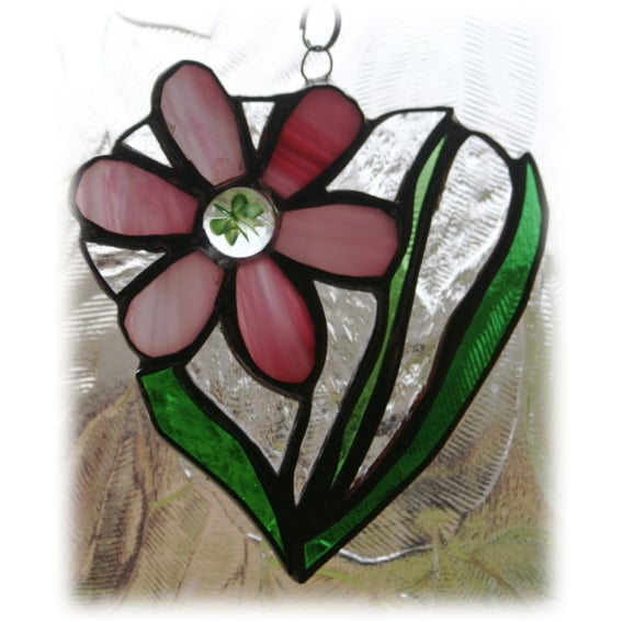 This is an original design and features a pretty six-petal pink daisy with a swirly clear and green glass nugget for a centre and with green strappy leaves.