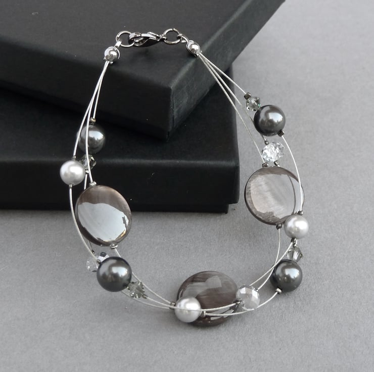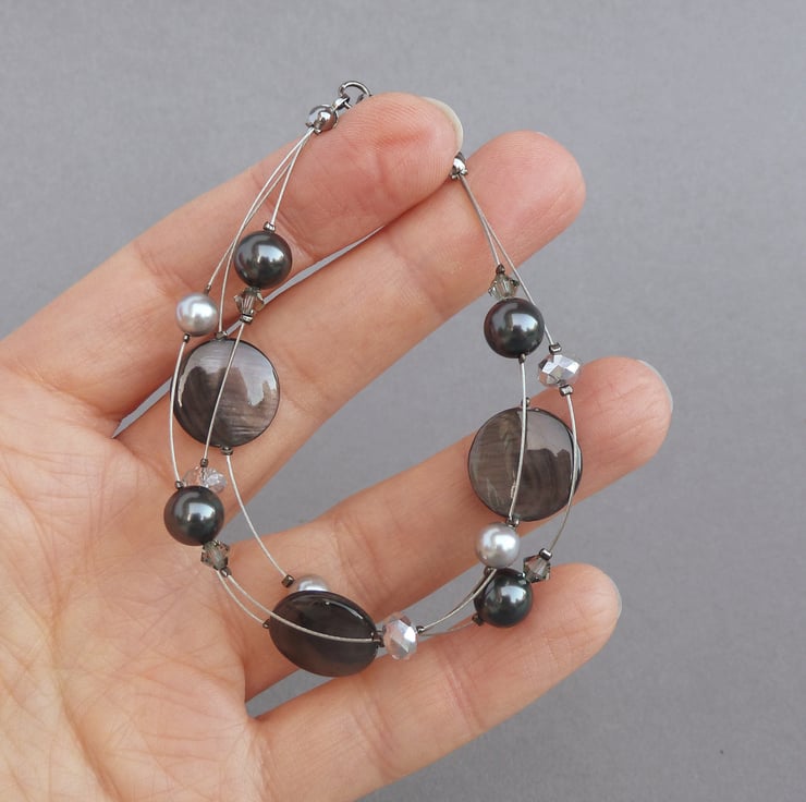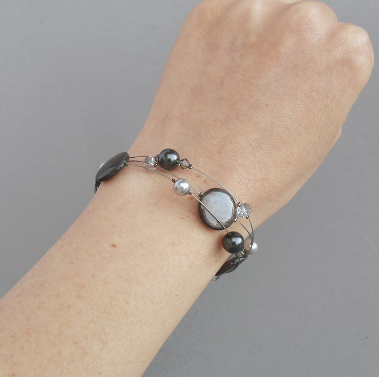 As it is neutral in colour, this dark grey multi-strand bracelet will look great with most colours but will look especially eye-catching with shades of grey or black. This floating pearl bracelet has been constructed using black Swarovski pearls, shell, Swarovski crystals and Czech crystals.