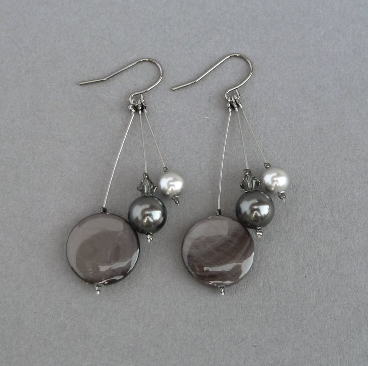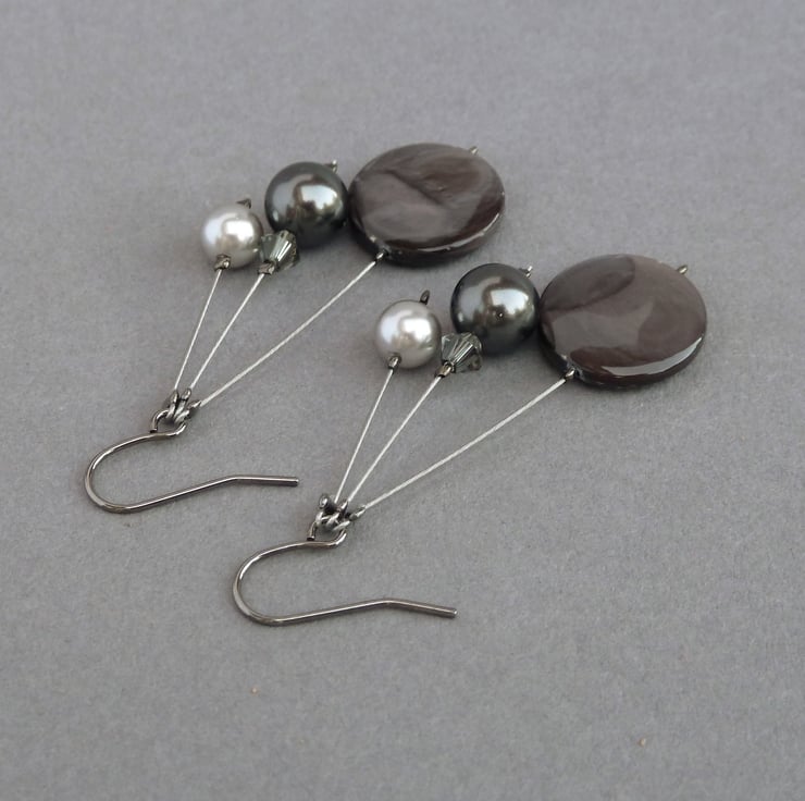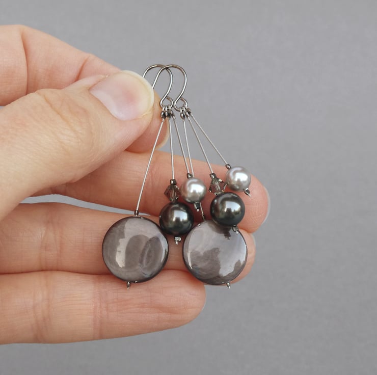 These dark grey, drop earrings are created using the finest crystals, shell, black glass pearls and Czech crystals. These three strand earrings are great for finishing off an outfit and can be worn everyday.