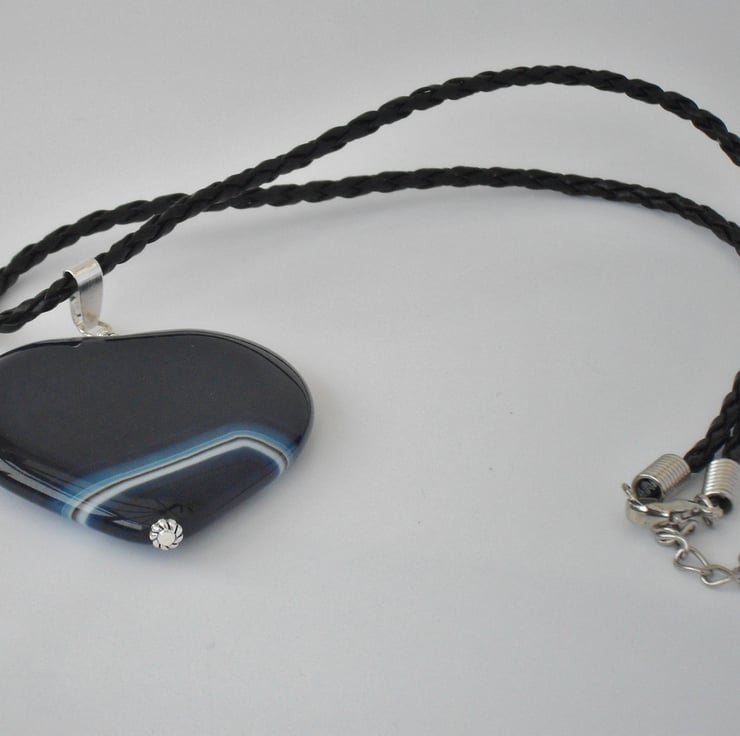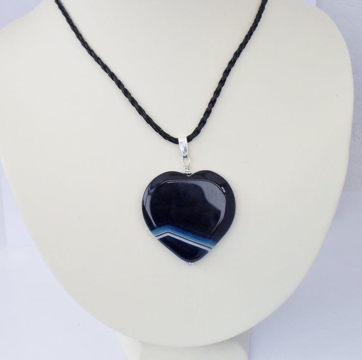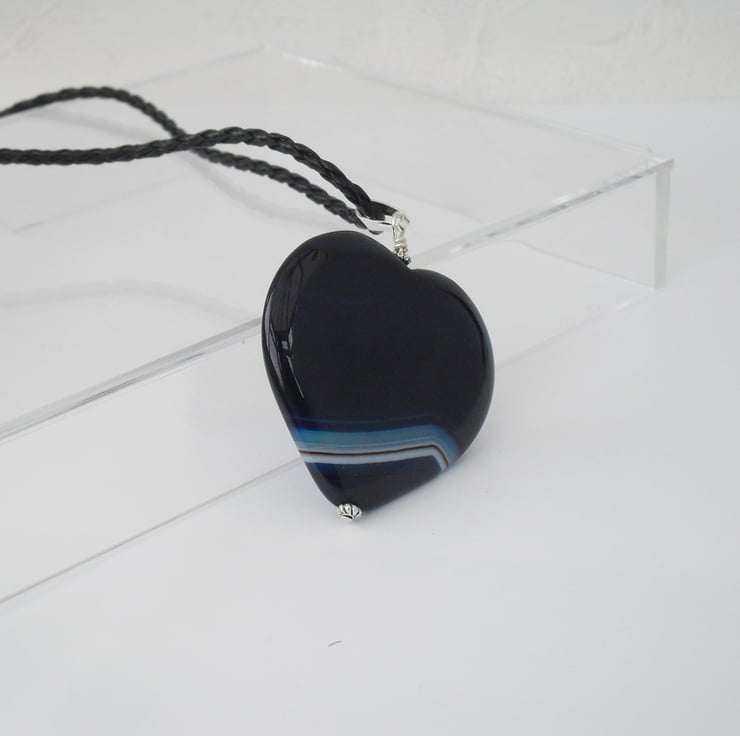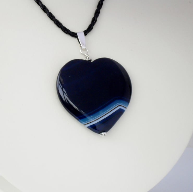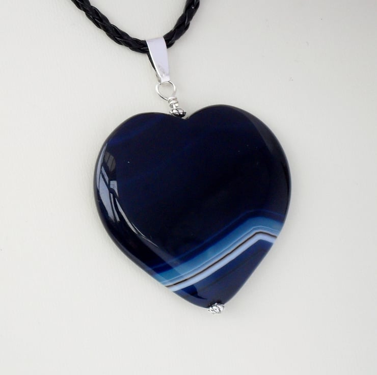 This stunning blue banded agate has been formed into a large heart pendant, which measures 4 1/2 cms high and wide at its maximum points.
