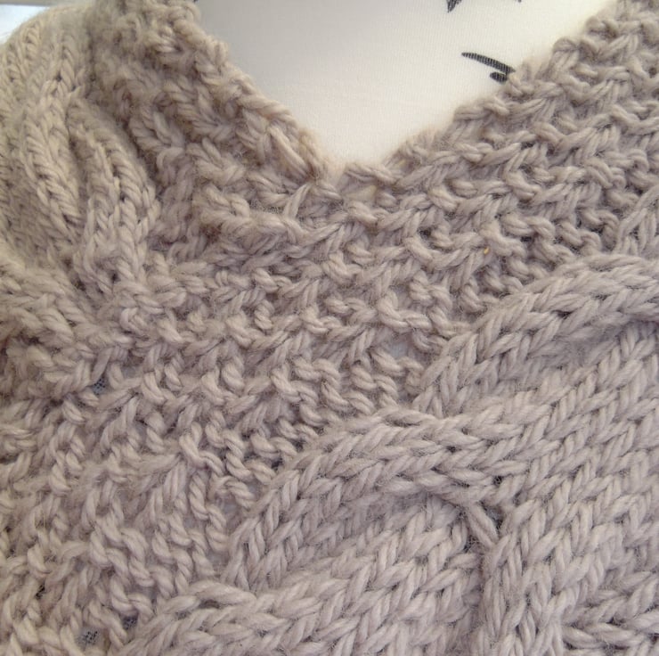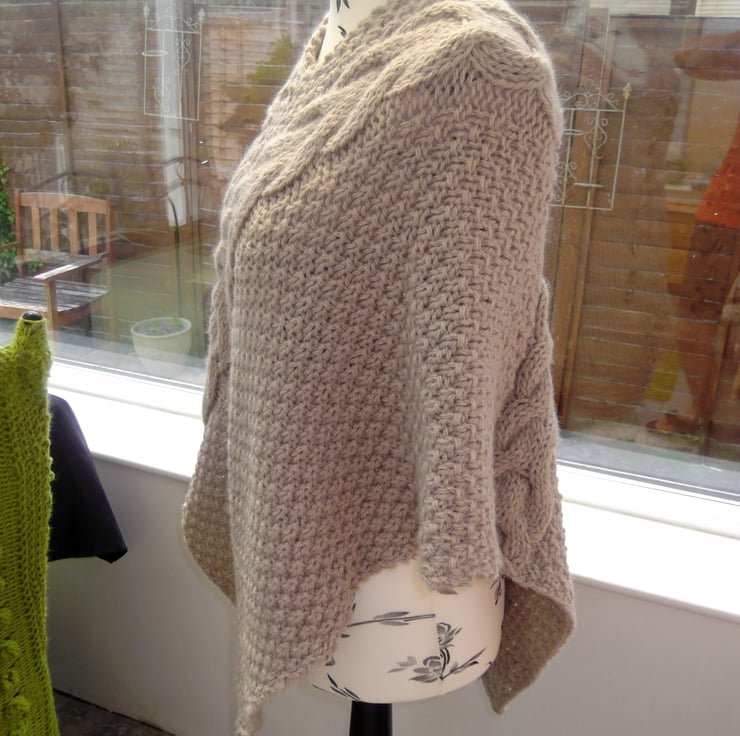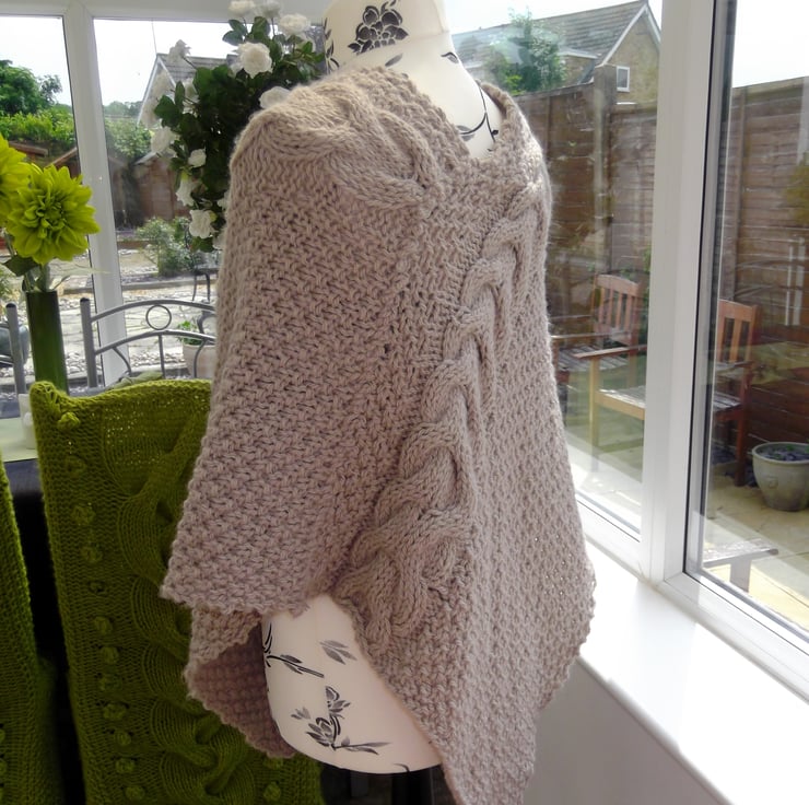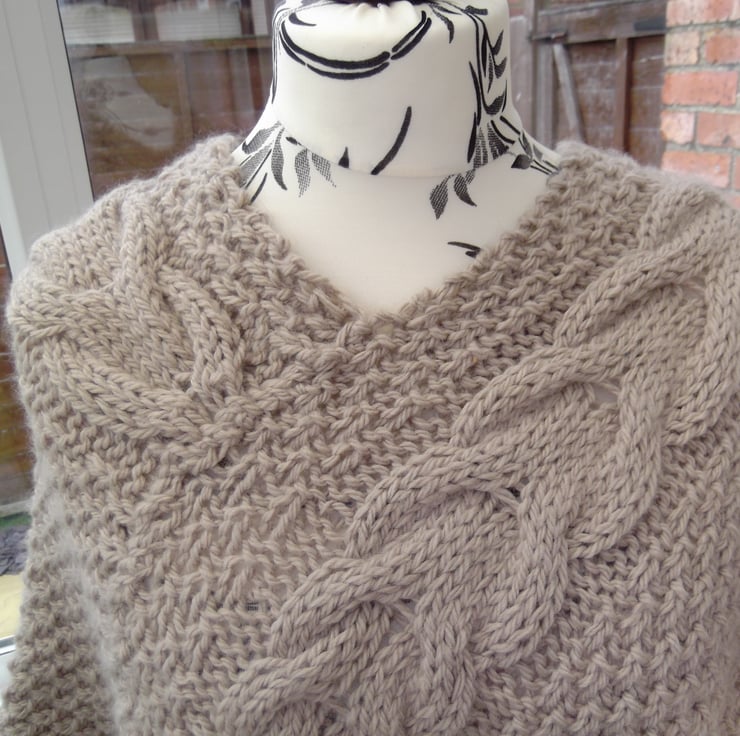 Beautiful taupe poncho knitted in chunky wool with a cable design.Perfect for those chilly days.Back design same as front.One size fits all.