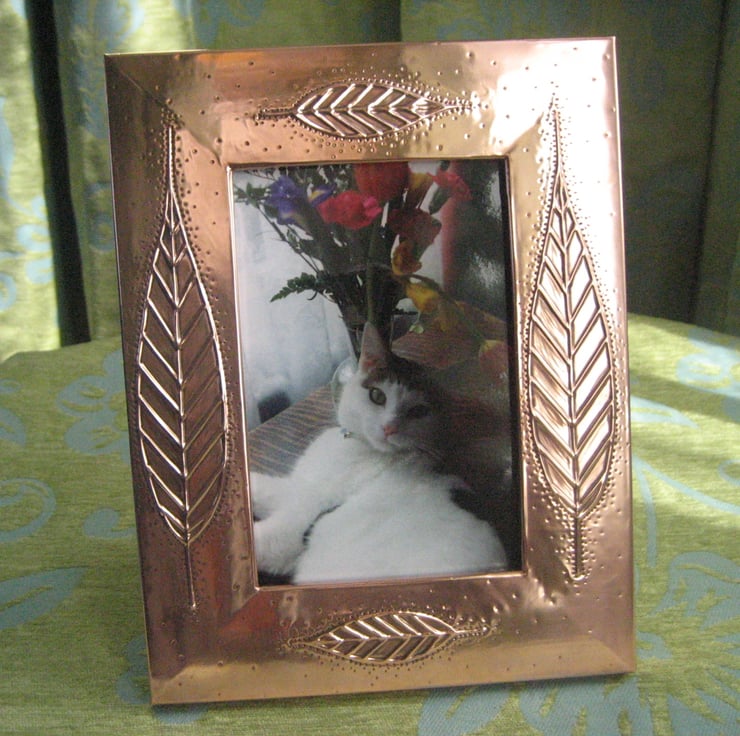 This frame has been handmade using the repousse method popular with the Arts and Crafts movement. It measures 173 x 220mm overall and will take a 4 x 6 inch photograph. The reverse, which is covered in black velour, has a stand and a ring for hanging. This would be a great gift for a 7th Wedding Anniversary or any other special occasion.