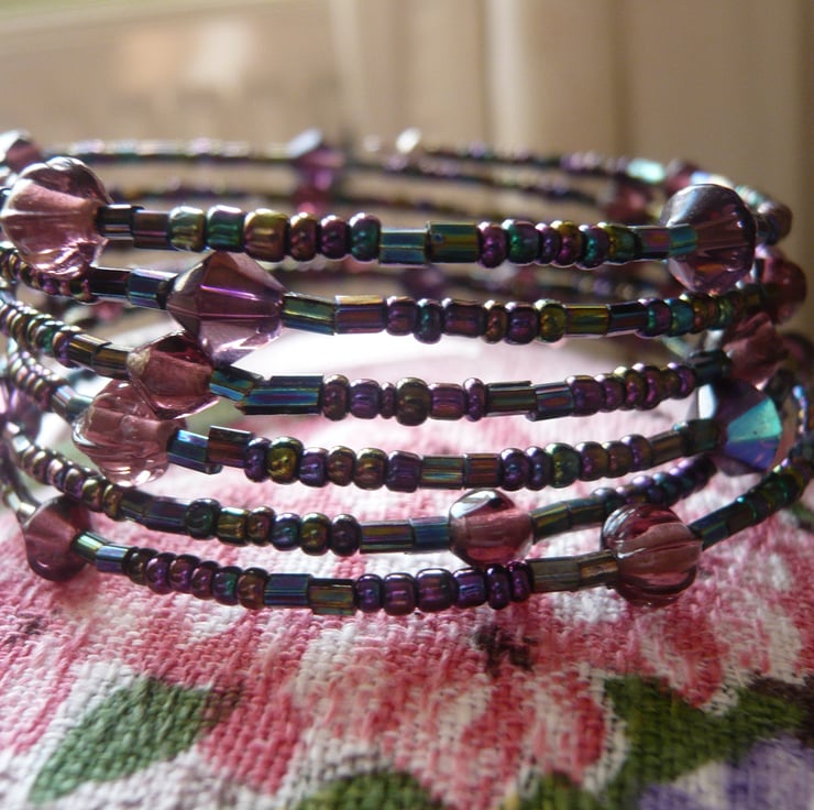 6 Coils of tiny seed beads and a variety of other purple coloured beads are used to make this bracelet.