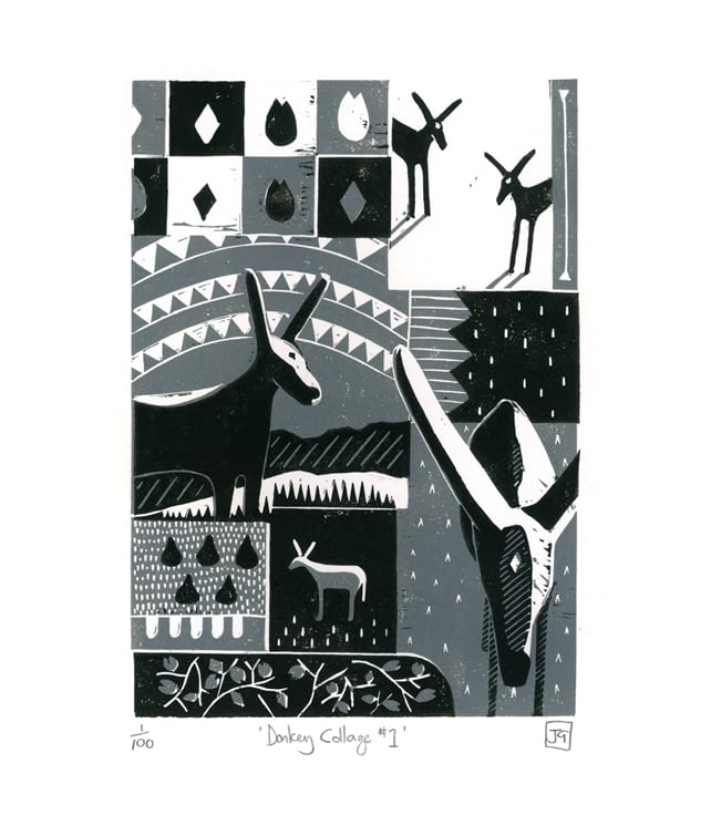 A hand-pressed 2-colour linocut print entitled 'Donkey Collage No.1'.