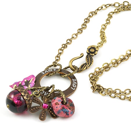 The feature circle is 22mm (3/4 inch across) and has the word 'LOVE' stamped 3 times around the rim. A decorative flower hook is used to fasten the necklace at the front.