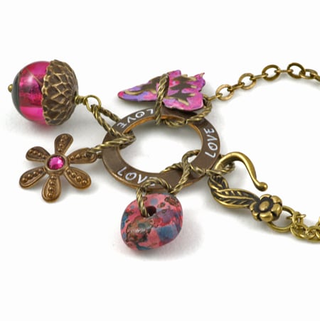 The round focal bead is a handmade glass bead in a deep pink fuchsia/magenta colour with silver inside which makes it shimmer. It also features a flower with a Swarovski crystal stone in the middle, a handmade ceramic square and a hand decorated butterfly