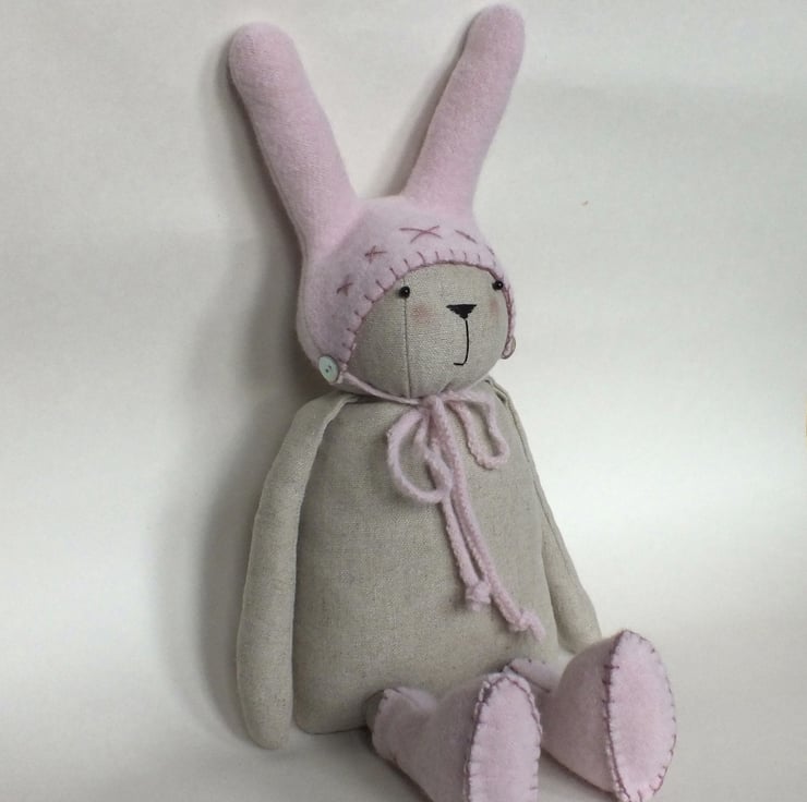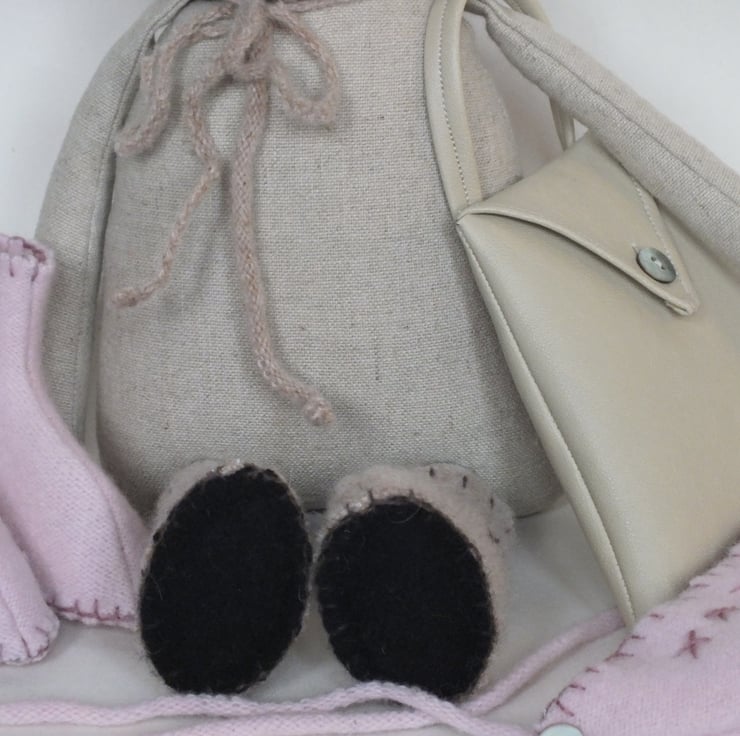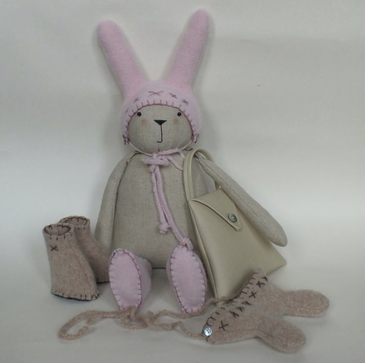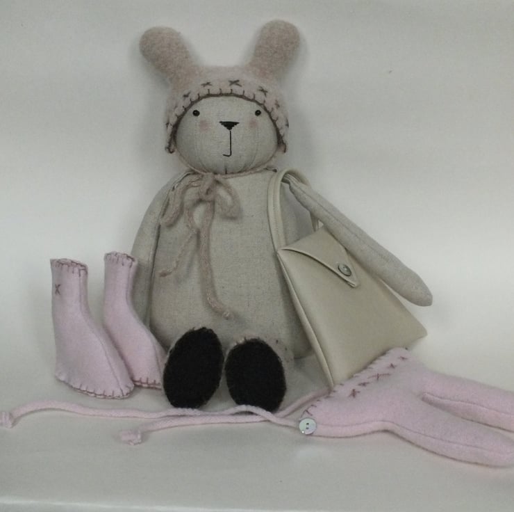 She has glass bead eyes and embroidered features. She has 2 hats - one is a Teddy hat and the other is a rabbit hat - both are made from semi felted lambswool and have been embroidered and trimmed with lovely mother of pearl buttons. She also has rabbit feet socks and teddy socks finished with blanket stitch. When she is being a ted you can store her rabbit hat and socks in her cream coloured handbag - which I made from leatherette and closes with a mother of pearl button.