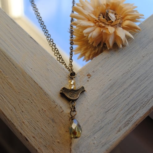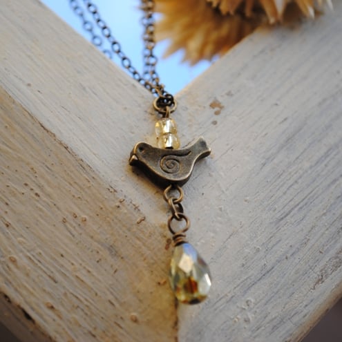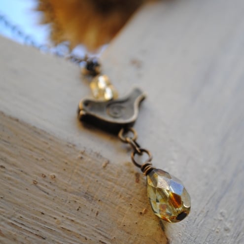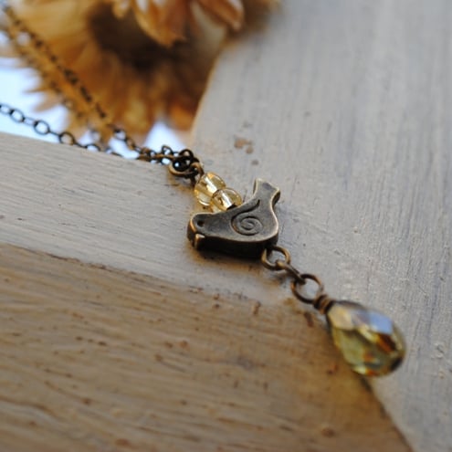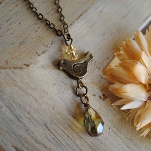 This pendant necklace is made with an antique brass / copper bird with a lovely lustre green / amber bead decoration.