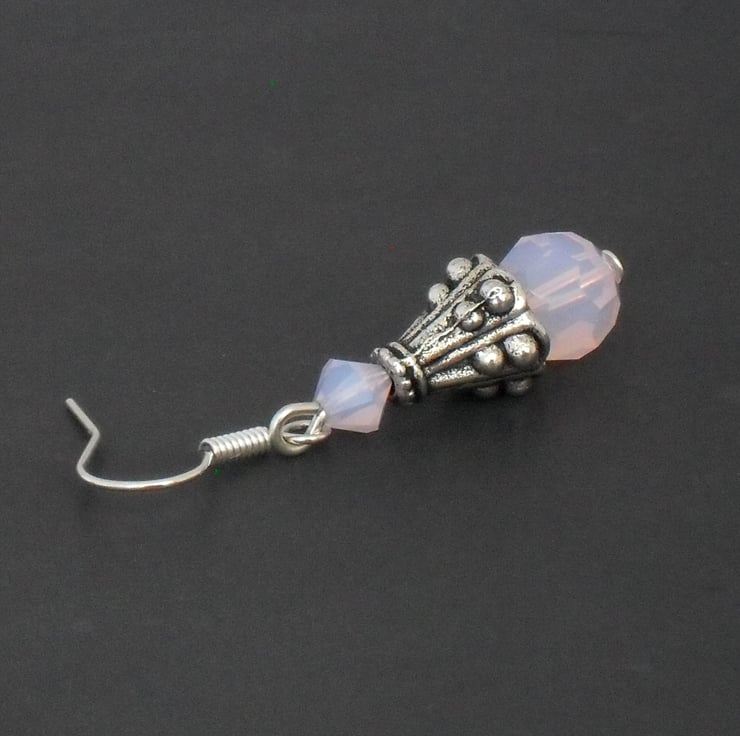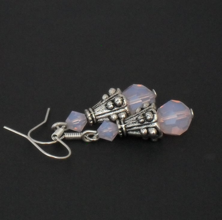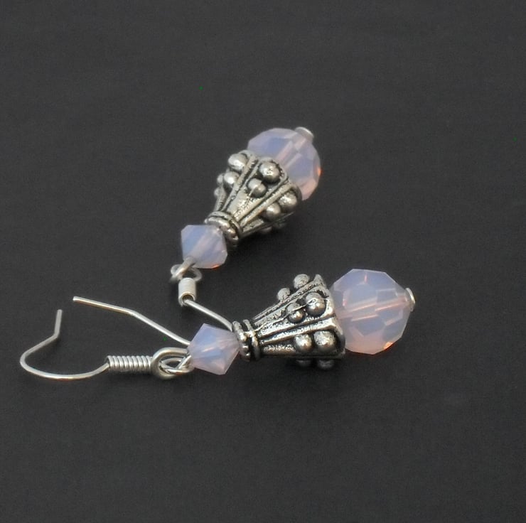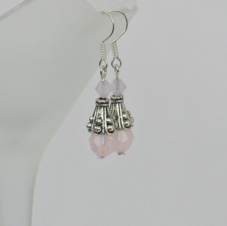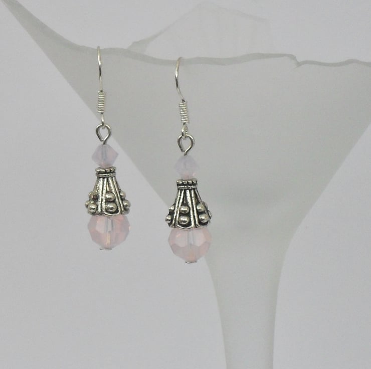 Very delicate pink crystals hang with ornate tibetan silver beadcaps to make these elegant earrings.