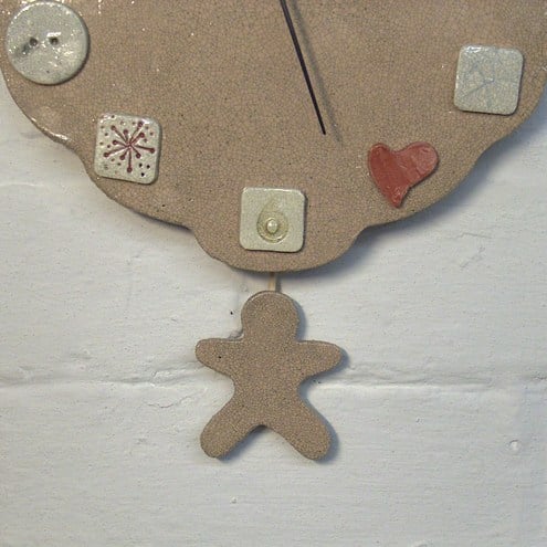 A rather unusual pendulum clock, made with quartz mechanism. The ceramic clock face is finished in a crackle glaze and decorated with an eclectic mix of handmade clay embelishments. The pendulum is a little clay gingerbread man shape, which swings from side to side.