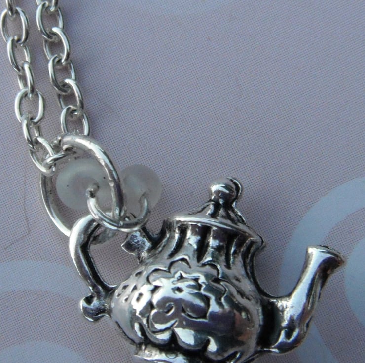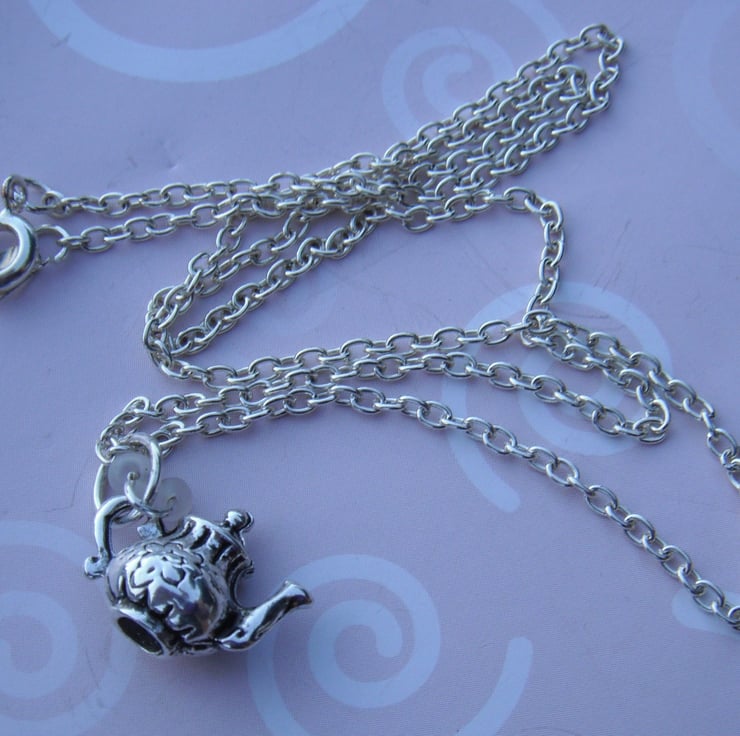 I have added a teapot charm and a couple of small white frosted beads to a silver plated chain.