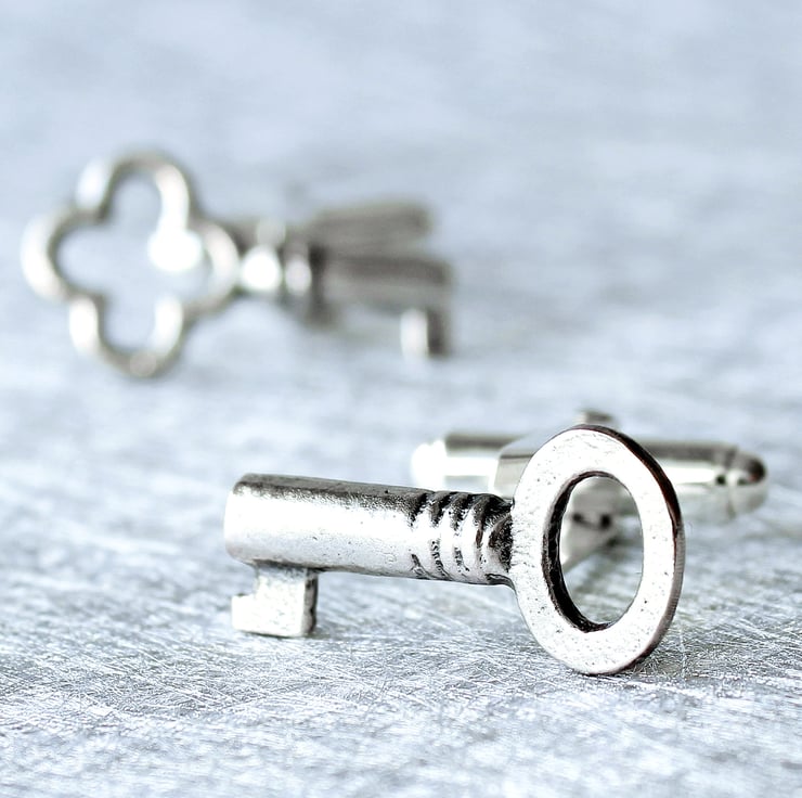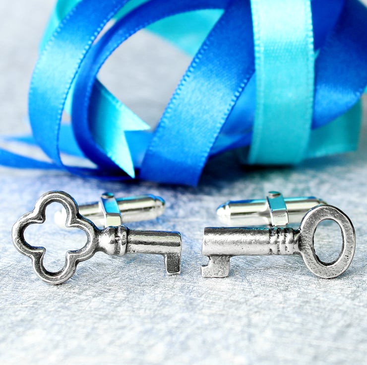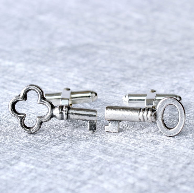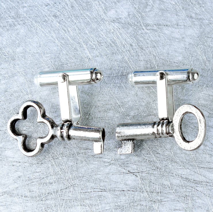 These lovely key cufflinks are made from sterling silver. We liked the idea that the keys should be different and think that the asymmetrical look works well, but if you prefer both keys to be the same, please get in touch. The silver keys have been oxidized to blacken them and then polished to give an antique look. They are set onto quality sterling silver double-hinged cufflink backs.