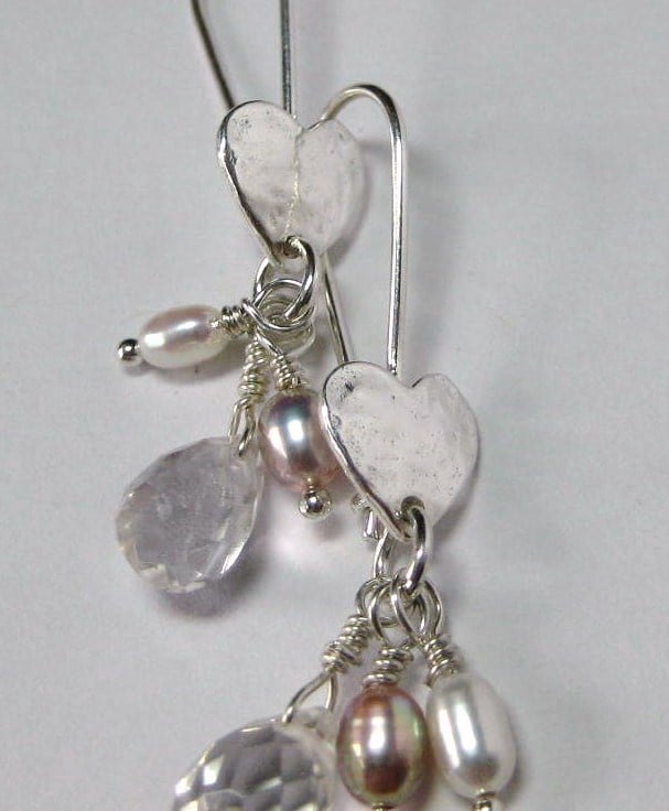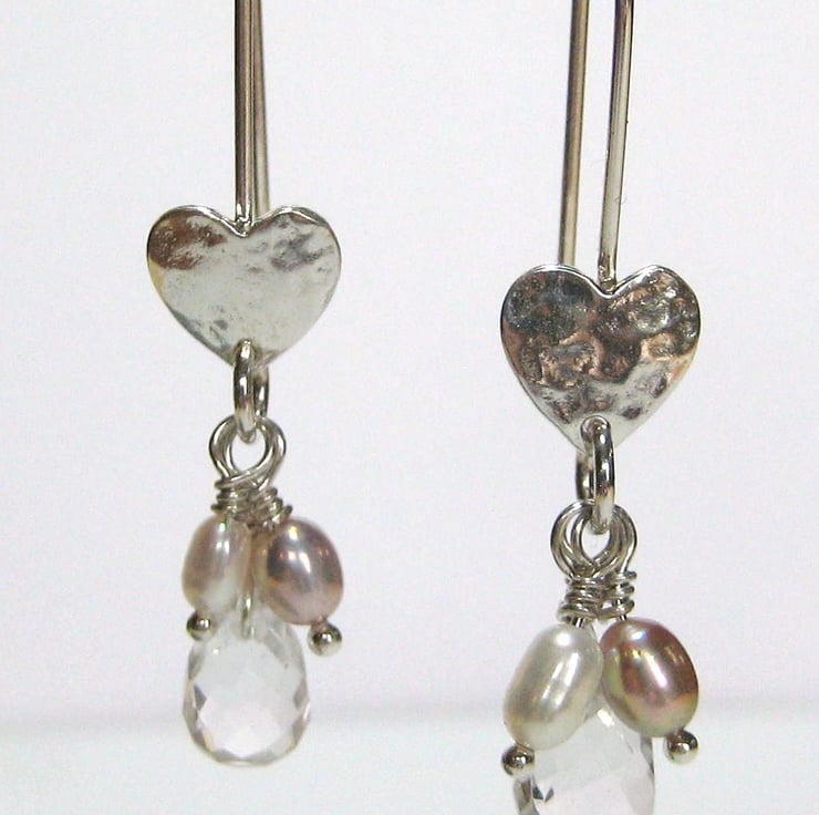 Pretty sterling silver earrings with a hammered texture. A sparkly rock crystal briolette is paired with rose and white fresh water pearls. The total drop is 35mm including the cluster. Ideal as a romantic gift or as an affordable treat.