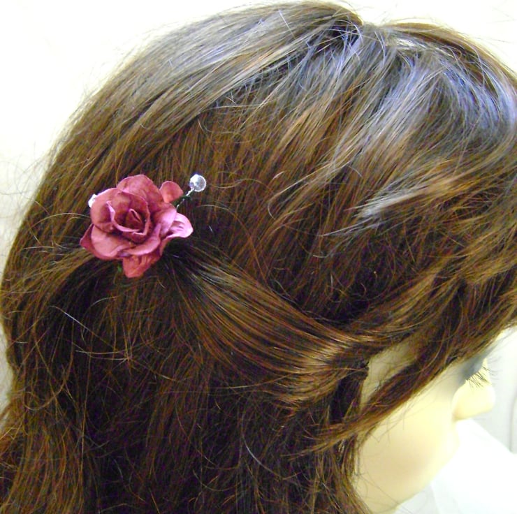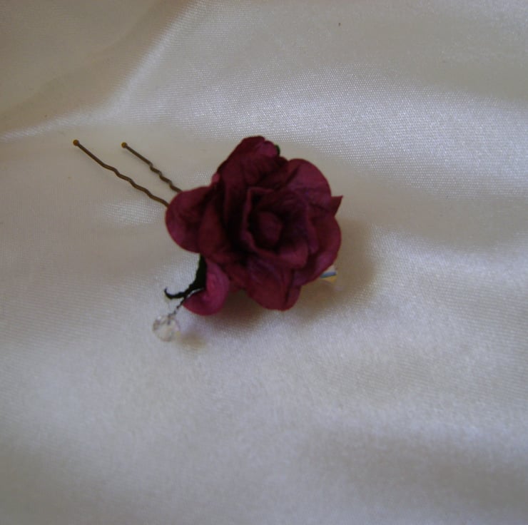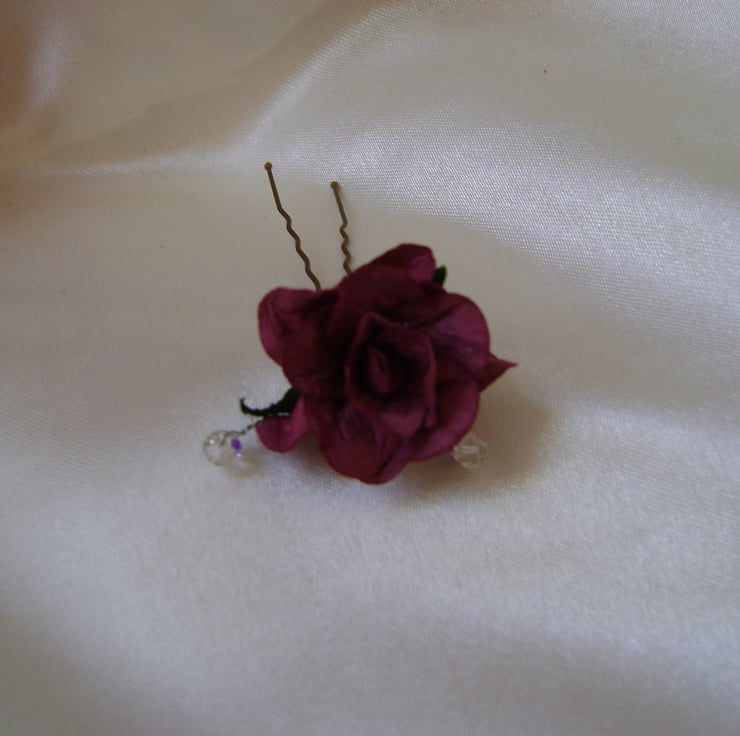 A very lovely hairpin created with a hand made burgundy wild rose, shimmering Swarovski crystals and silver plated metal wire. Measurements of hairpin including design is approx 8cm. Ideal for Bridesmaid or Flower Girl, and a few looks great in an updo hairstyle - no extra postage when buying more than one item x