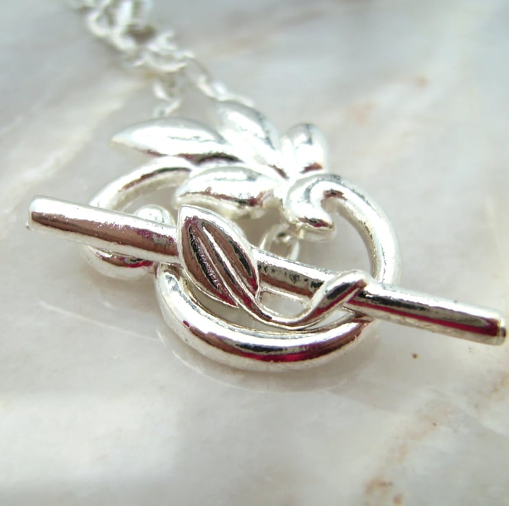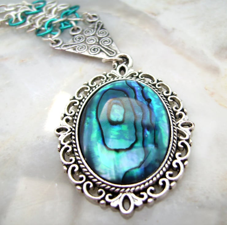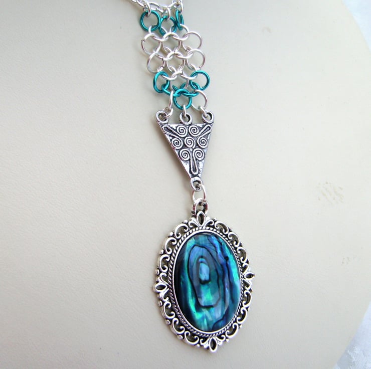 This exquisite necklace has been created with a 1 inch section of handmade chainmaille with a paua / abalone shell ( dyed deeper blue) cabochon set in a silver tone filigree mount. They are connected together with a silver tone triangle shape connector & hung on a 17 inch silver plated chain.