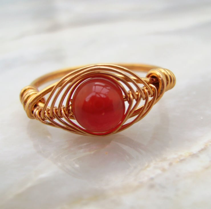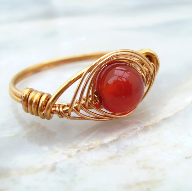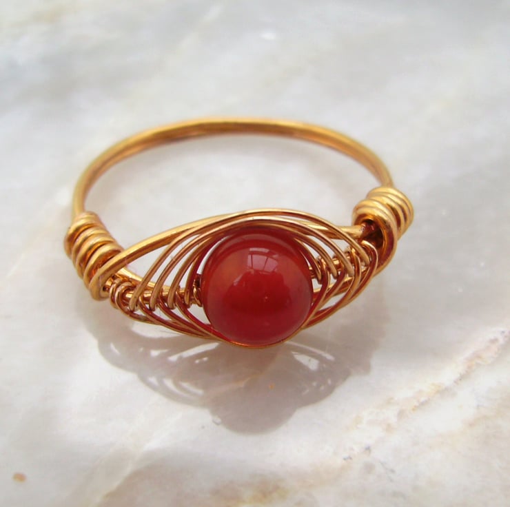 This lovely warm ring has been created using gold plated wire wrapped by hand in herring bone weave around a 6mm carnelian bead.