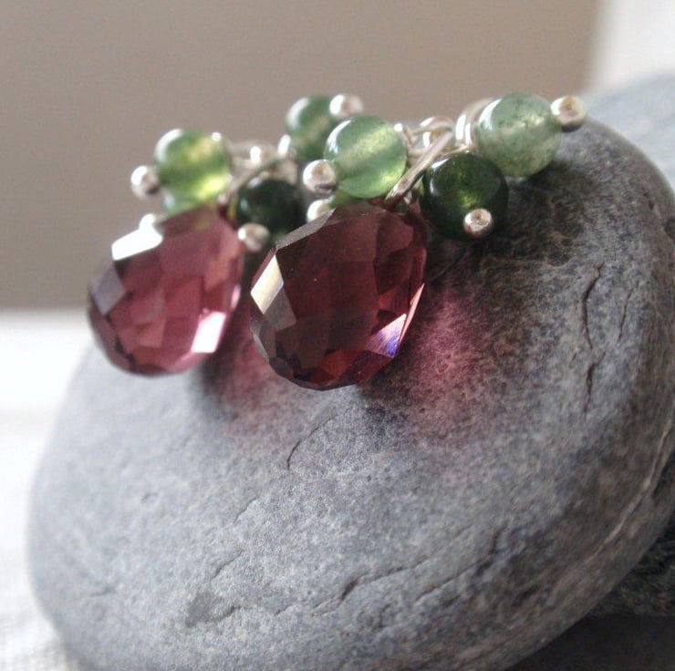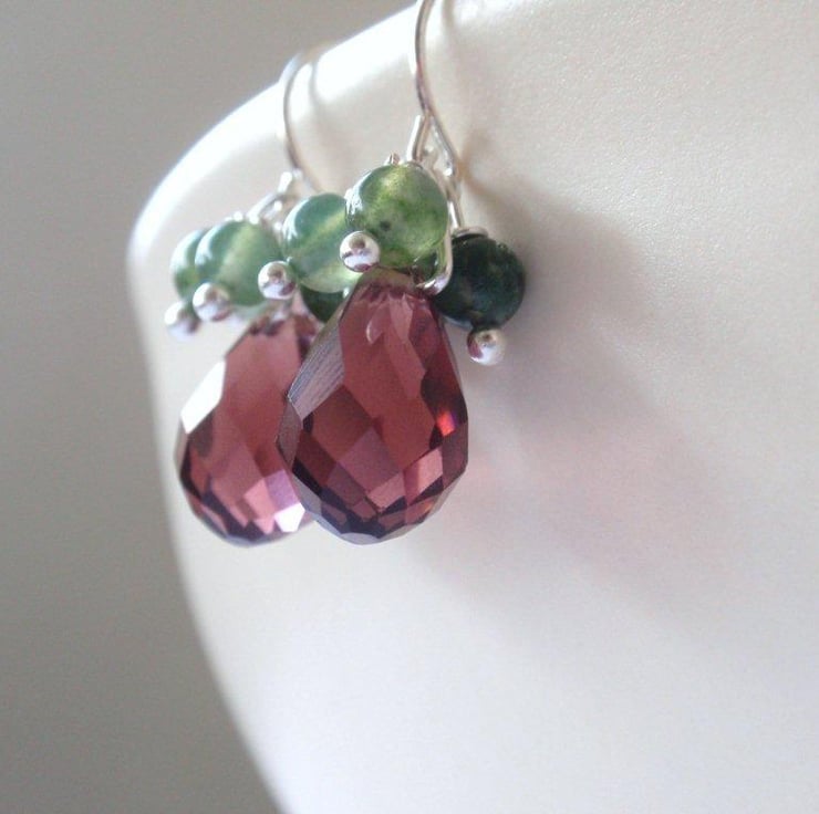 These gorgeous earrings are made from 1.2cm amethyst coloured faceted crystals adorned with 4 moss agate gemstone beads (4mm) on each earring. Beautifully sumptious and unusual earrings on a silver plated hook. These would make a lovely gift or a treat for youself.
