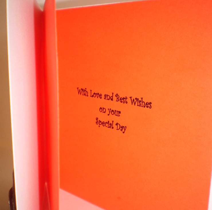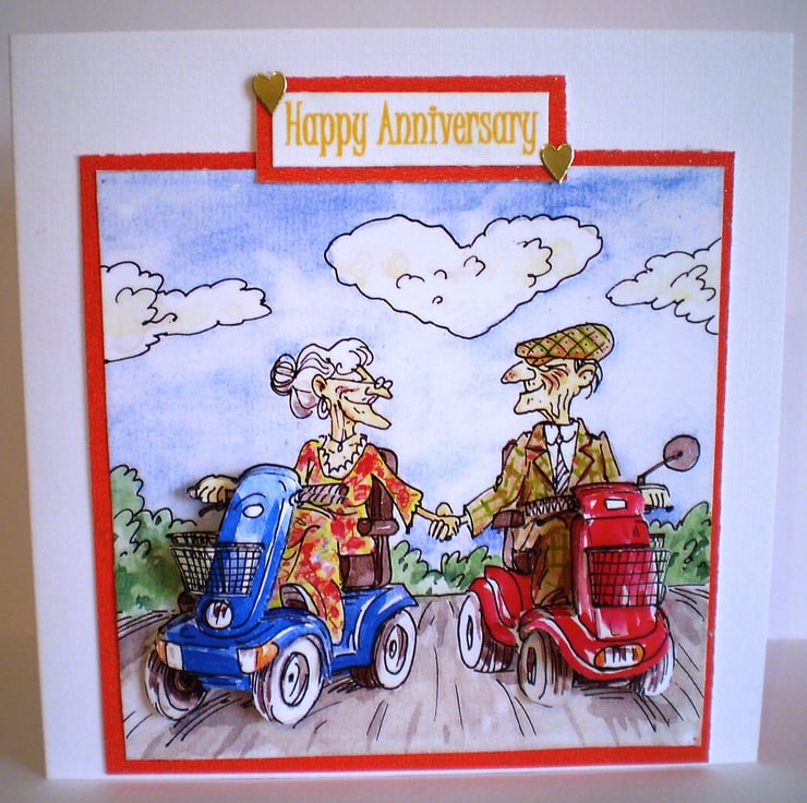 A humorous anniversary card measuring 144x144mm (5.5x5.5). This is a decoupage 3D effect card but there isn't a lot of detail in this print. Insert is red with hearts punched out in corner and some words