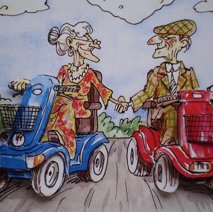 A humorous anniversary card measuring 144x144mm (5.5x5.5). This is a decoupage 3D effect card but there isn't a lot of detail in this print. Insert is red with hearts punched out in corner and some words